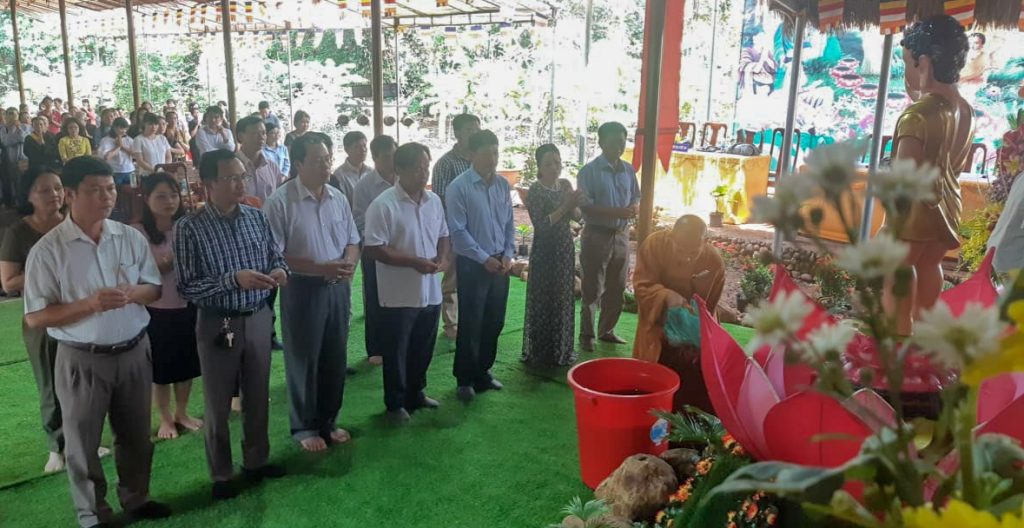 Nhân dịp Đại lễ, đại diện UBMTTQVN huyện cũng phát biểu chúc mừng Đại lễ Phật đản, đồng thời gửi tặng nhiều lẵng hoa chúc mừng tới buổi lễ. Sau đó toàn thể chư tôn đức Tăng Ni cùng đại diện chính quyền và đồng bào Phật tử trang nghiêm cử hành nghi lễ rước Đản sanh với nghi thức tụng kinh Khánh đản, thả chim bồ câu, bong bóng cầu hòa bình, nguyện cho chúng sinh an lạc.