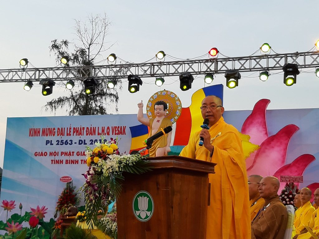 Tại buổi lễ, đại diện cho các cấp chính quyền phát biểu chúc mừng Đại lễ Phật đản Vesak 2019, ông Lê Tuấn Phong – Phó Chủ tịch UBND tỉnh bày tỏ sự vui mừng về sự thành công tốt đẹp, để lại tiếng vang tốt lành sau khi Giáo hội được sự đồng thuận của Đảng, nhà nước đã tổ chức thành công Đại lễ Phật đản Liên Hợp Quốc tại chùa Tam Chúc tỉnh Hà Nam. Ông cũng đánh giá cao những hoạt động tích cực của Phật giáo tỉnh nhà đã thể hiện tinh thần hộ quốc an dân trong mùa Phật đản năm nay.
