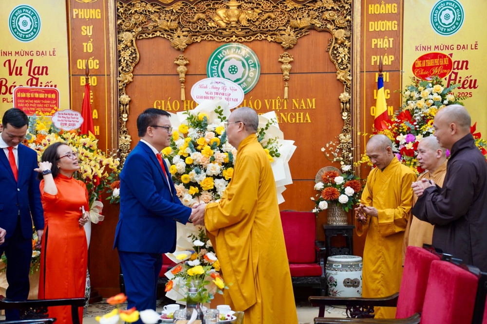 Nhân dịp này các phái đoàn đã trao tặng lẵng hoa chúc mừng chư Tôn đức lãnh đạo GHPGVN trong không khí tràn đầy hỷ lạc.