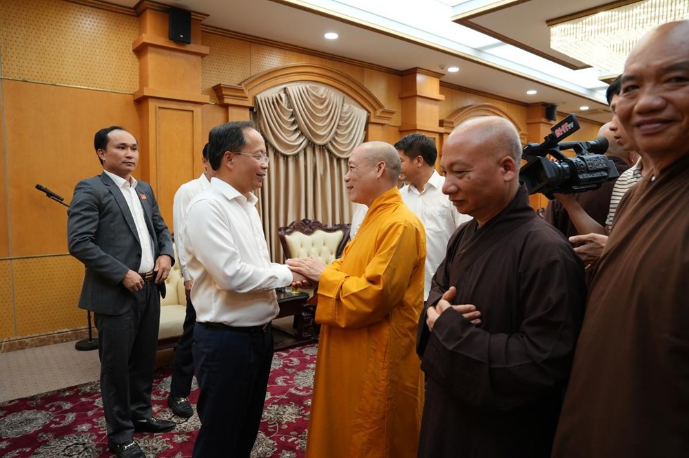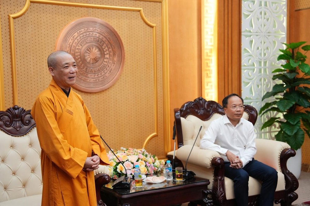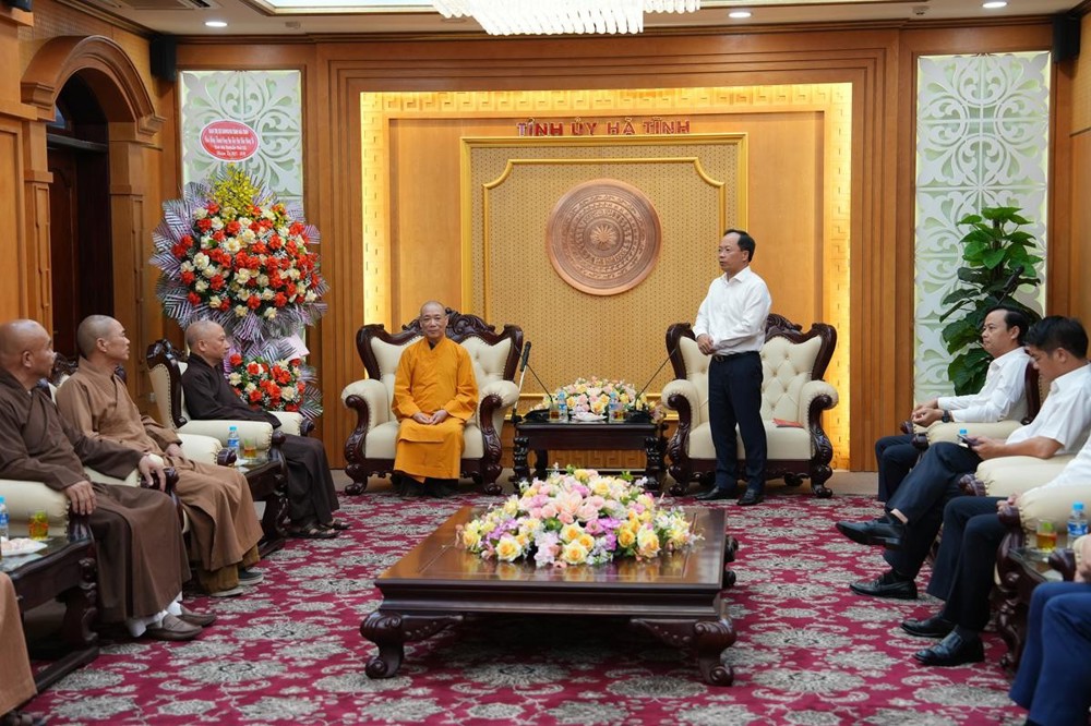 Thay mặt lãnh đạo tỉnh, Bí thư Tỉnh ủy đánh giá cao sự hỗ trợ kịp thời cả về mặt vật chất lẫn tinh thần của chư Tăng Ni, Phật tử giúp bà con nhân dân bị ảnh hưởng bởi cơn bão số 10 sớm vượt qua khó khăn trước mắt. Đồng thời, ông gửi lời cảm ơn sâu sắc tới Ban Trị sự Giáo hội Phật giáo Việt Nam tỉnh đã luôn đồng hành, phối hợp chặt chẽ với cấp ủy, chính quyền địa phương trong thực hiện các nhiệm vụ phát triển kinh tế xã hội thời gian qua; thông tin thêm tới đoàn một số kết quả của Đại hội Đảng bộ tỉnh lần thứ XX, nhiệm kỳ 2025 - 2030.