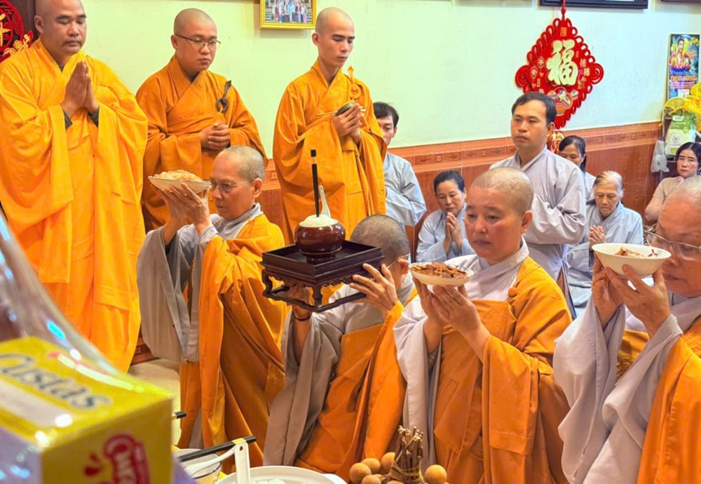 Chư Tôn đức Ban Lễ sư cùng môn đồ pháp quyến đã cử hành các nghi thức nhiễu tháp, cúng ngọ và cung tiến Giác linh cố Ni trưởng cao đăng Phật quốc trong không khí trang nghiêm, thành kính.
