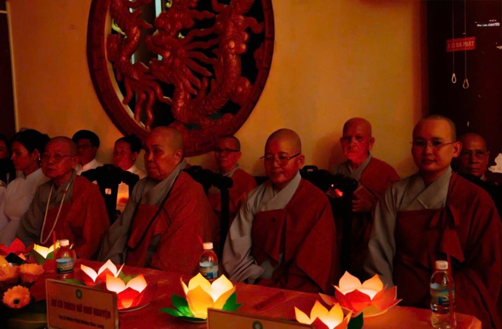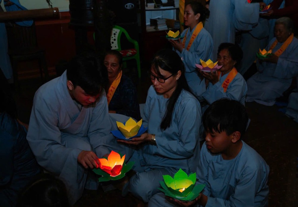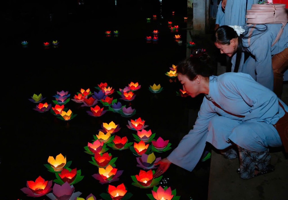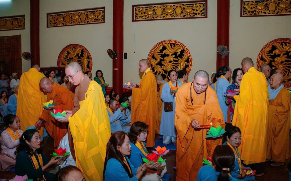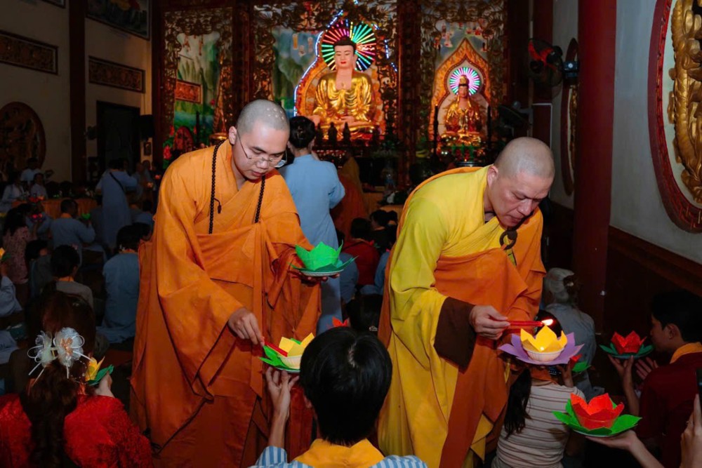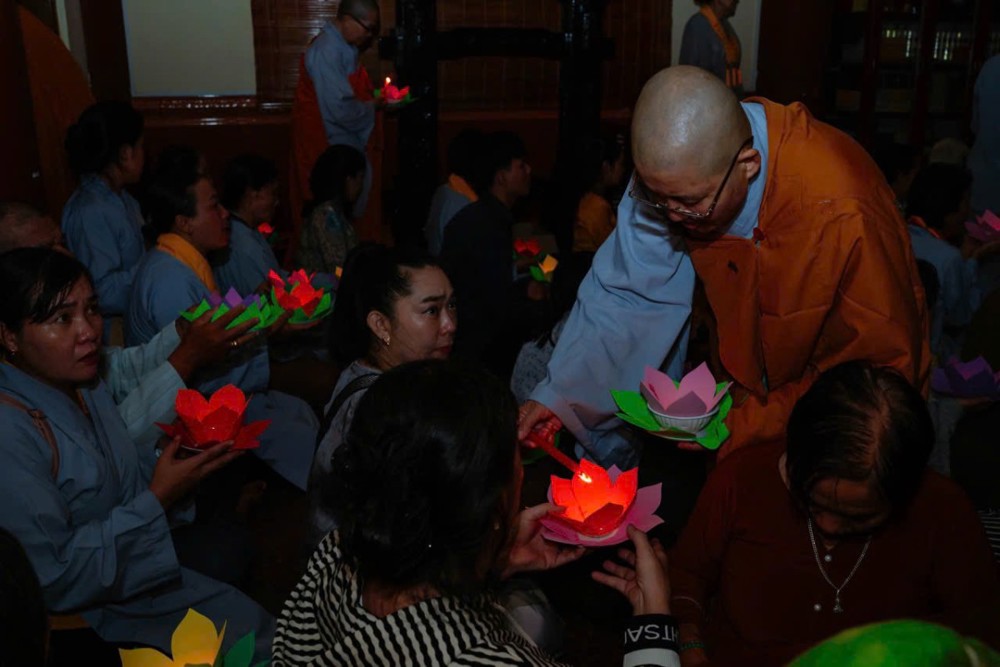 Nghi thức truyền đăng là điểm nhấn trang nghiêm và xúc động của buổi lễ. Từ ánh sáng nơi Phật đài, những ngọn hoa đăng được lần lượt trao truyền khắp đạo tràng, tượng trưng cho quang minh trí tuệ và lòng từ bi lan tỏa, soi sáng tự tâm mỗi người và gửi gắm ước nguyện hòa bình, an lạc đến muôn loài.