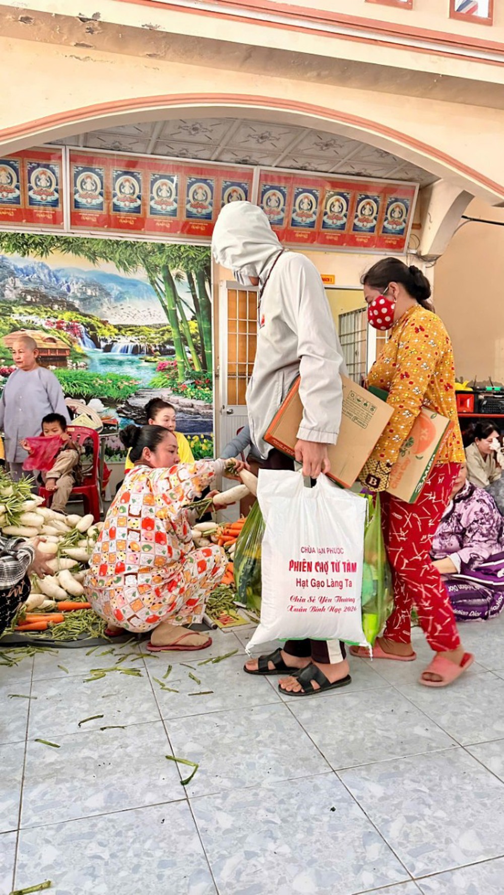 Từ đầu giờ chiều, không gian chùa đã trở nên nhộn nhịp hơn thường ngày. Người dân đến phiên chợ với tâm thế nhẹ nhàng, thân quen. Những lời thăm hỏi giản dị, những nụ cười hiền hòa, những ánh mắt chan chứa niềm vui đã làm cho khoảng cách giữa người cho và người nhận dường như tan biến. Tất cả cùng gặp nhau trong sự bình đẳng của tình người, không phân biệt hoàn cảnh hay điều kiện sống.