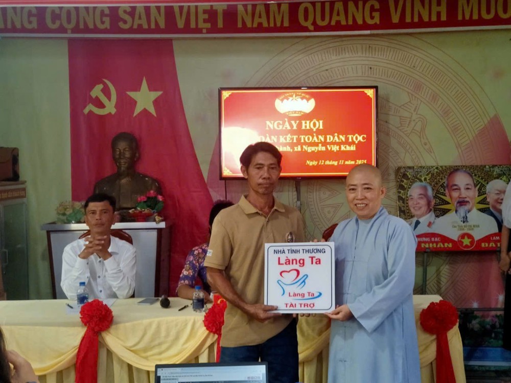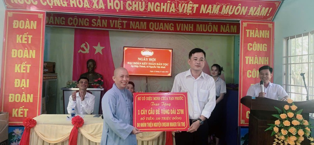 PSO- Thực hiện hạnh nguyện từ bi của người con Phật, sáng ngày 12/11/2025, trong ngày hội Đại Đoàn kết Dân tộc tổ chức tại trụ sở ấp Hưng Hiệp xã Nguyễn Việt Khái tỉnh Cà Mau, Sư cô Thích Nữ Diệu Minh, ủy viên Ban Trị sự Phật giáo tỉnh, Chánh Thư ký Phân ban Ni giới tỉnh, trụ trì chùa Vạn Phước (ấp Lê Năm, xã Nguyễn Việt Khái) đã trao cho đại diện UBMTTQVN xã kinh phí xây dựng một cây cầu dân sinh và một nhà tình thương, tặng 30 phần quà nghĩa tình cho các hộ nghèo.