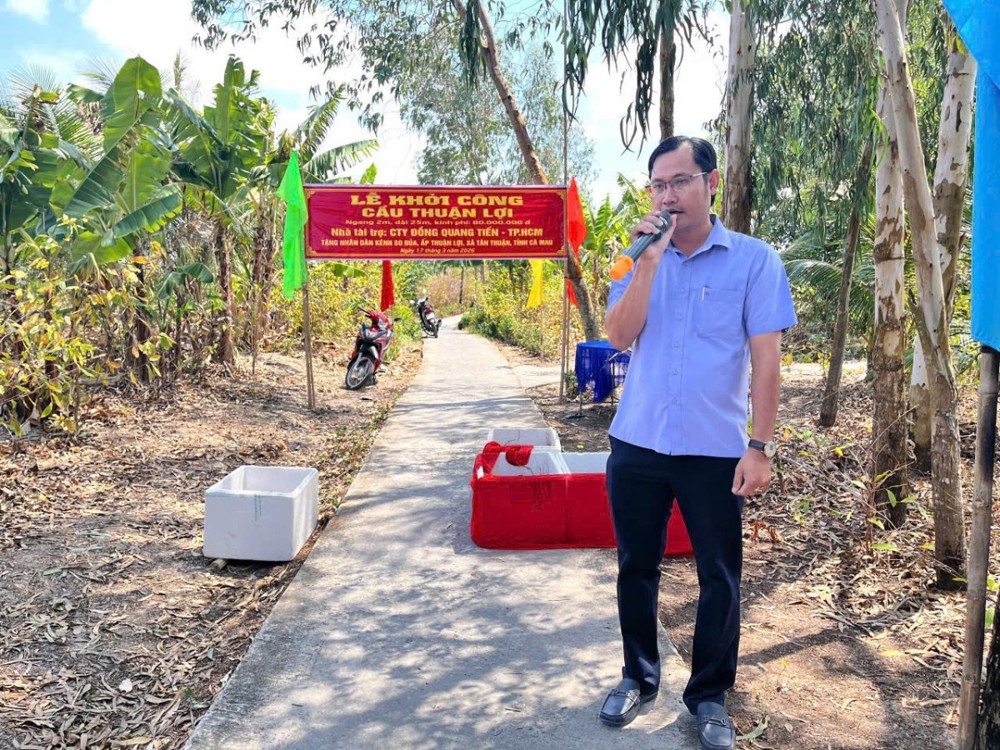 Thay mặt chính quyền xã Tân Thuận, ông Trần Hoàng Bách, Phó Chủ tịch UBND xã, gửi lời tri ân sâu sắc đến Ban TTXH Phật giáo tỉnh, những người đã làm cầu nối để các tấm lòng hảo tâm đến được với bà con. Cảm ơn các nhà tài trợ đã đồng hành cùng địa phương trong công tác xây dựng cầu nông thôn, góp phần thúc đẩu văn hóa xã hội tại xã nhà.