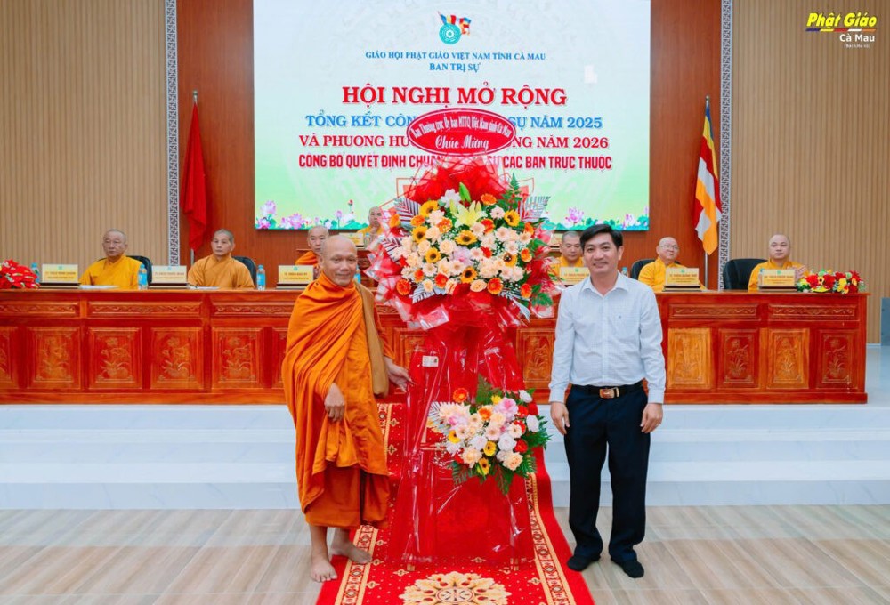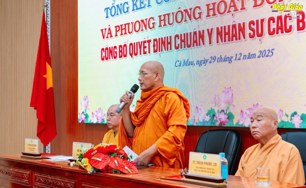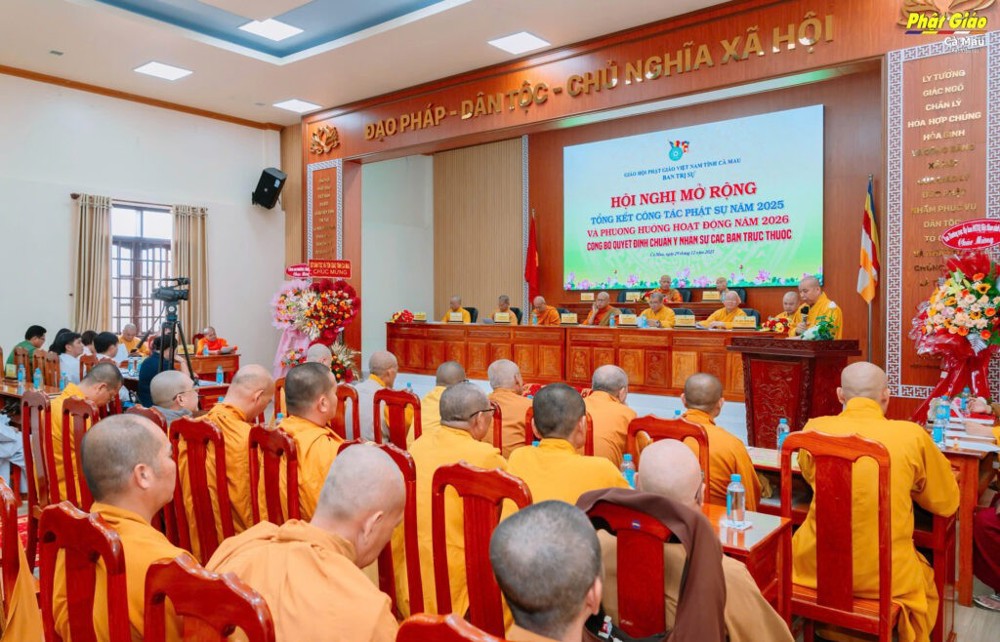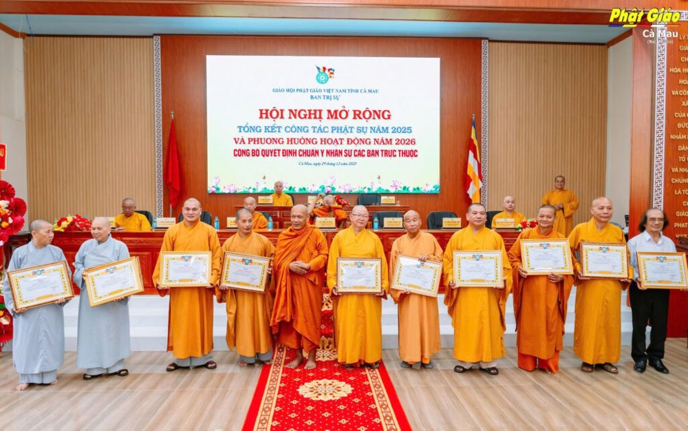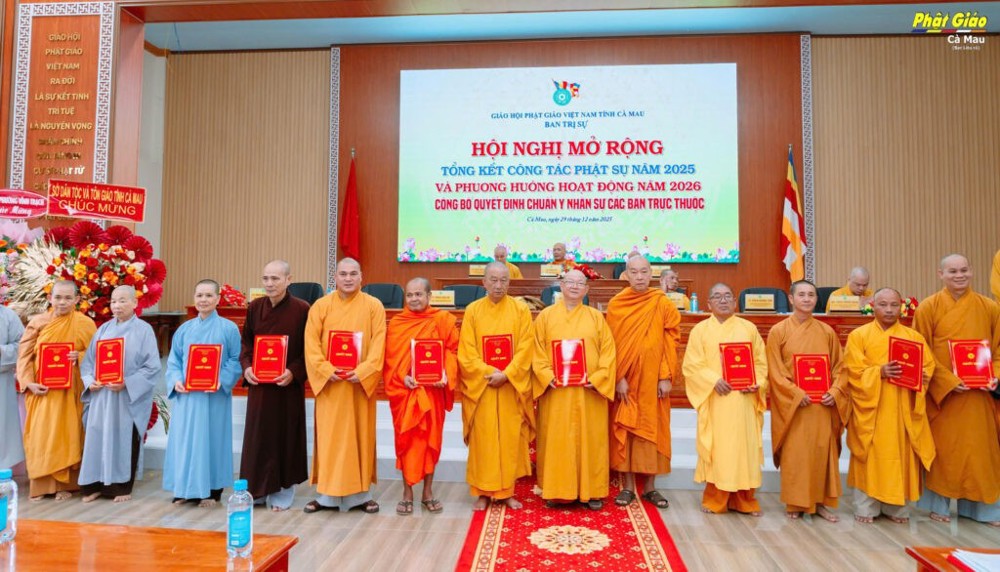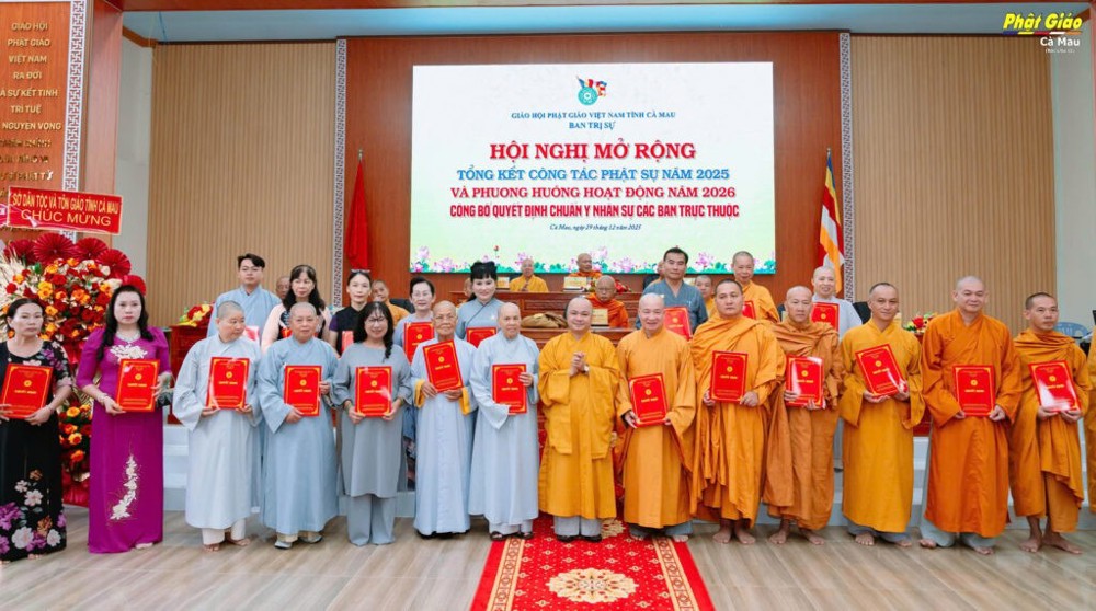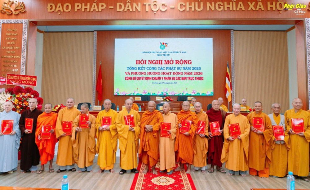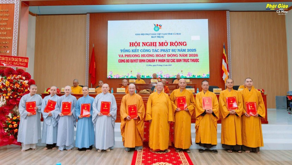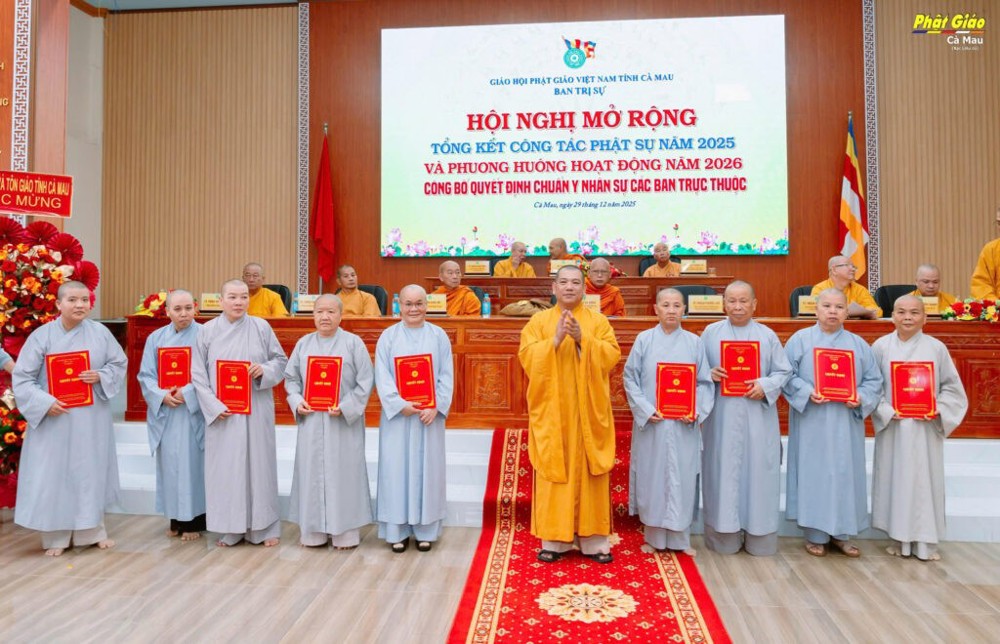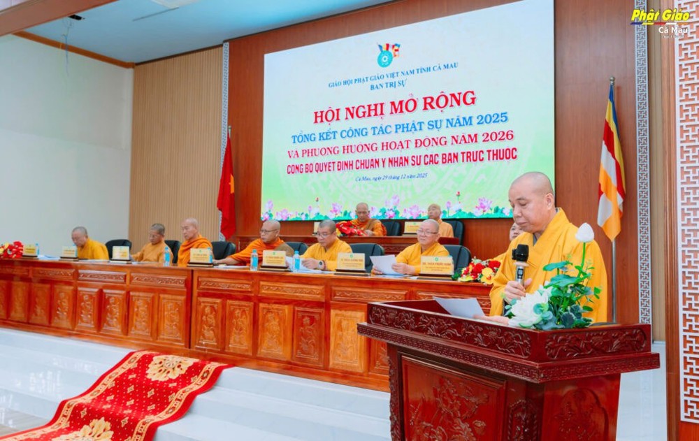 Sáng 29/12/2025, tại hội trường trụ sở Ban Trị sự GHPGVN tỉnh Cà Mau (chùa Long Phước, phường Vĩnh Trạch), Ban Trị sự GHPGVN tỉnh tổ chức Hội nghị mở rộng tổng kết công tác Phật sự năm 2025 và phương hướng hoạt động năm 2026, đồng thời công bố quyết định chuẩn y nhân sự các ban trực thuộc.