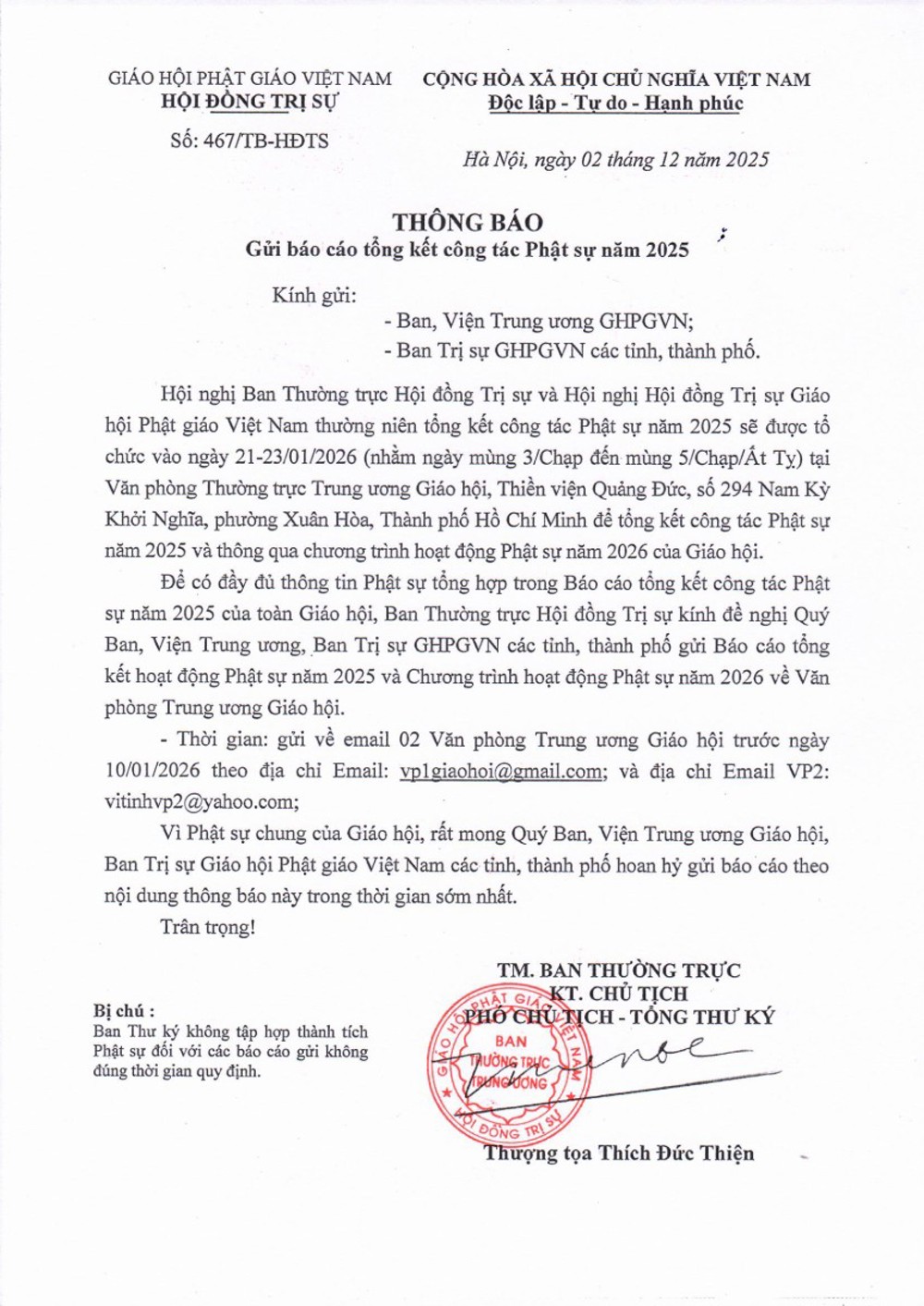 Để phục vụ công tác tổng hợp báo cáo chung, Ban Thường trực Hội đồng Trị sự đề nghị các đơn vị gửi về Văn phòng Trung ương Giáo hội báo cáo tổng kết Phật sự năm 2025 và kế hoạch hoạt động năm 2026 trước ngày 10/01/2026, qua hai địa chỉ email: vp1giaohoi@gmail.com và vitinhvp2@yahoo.com