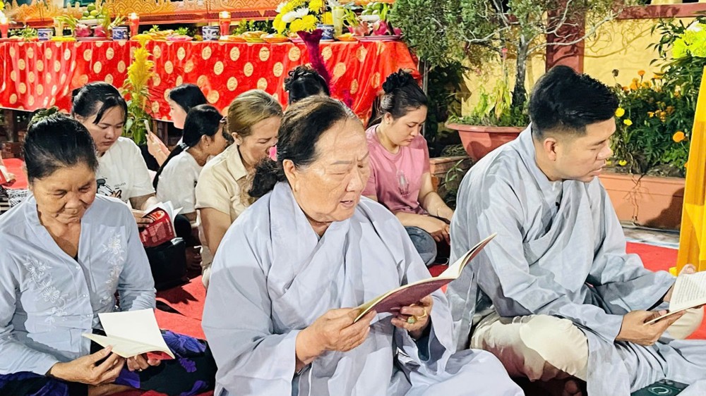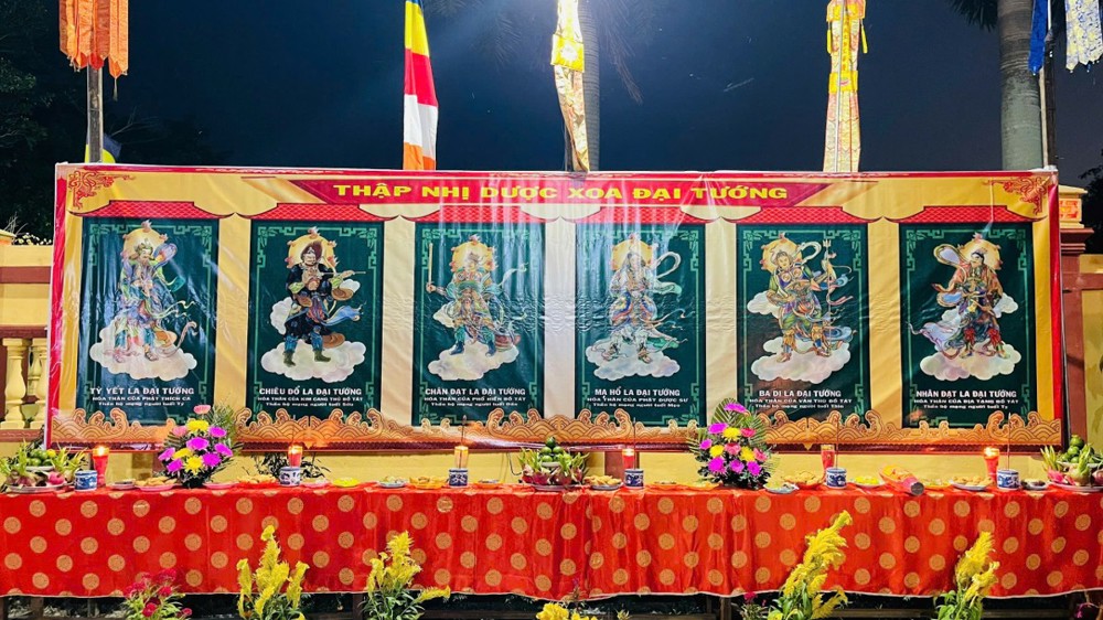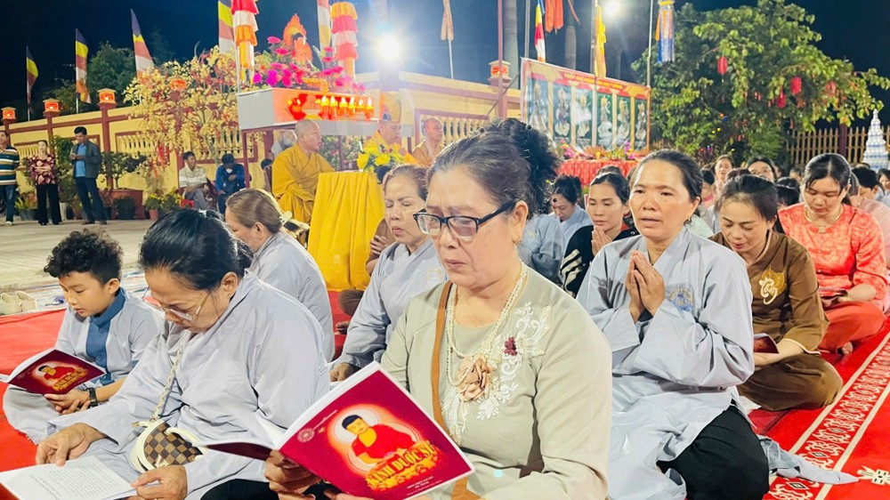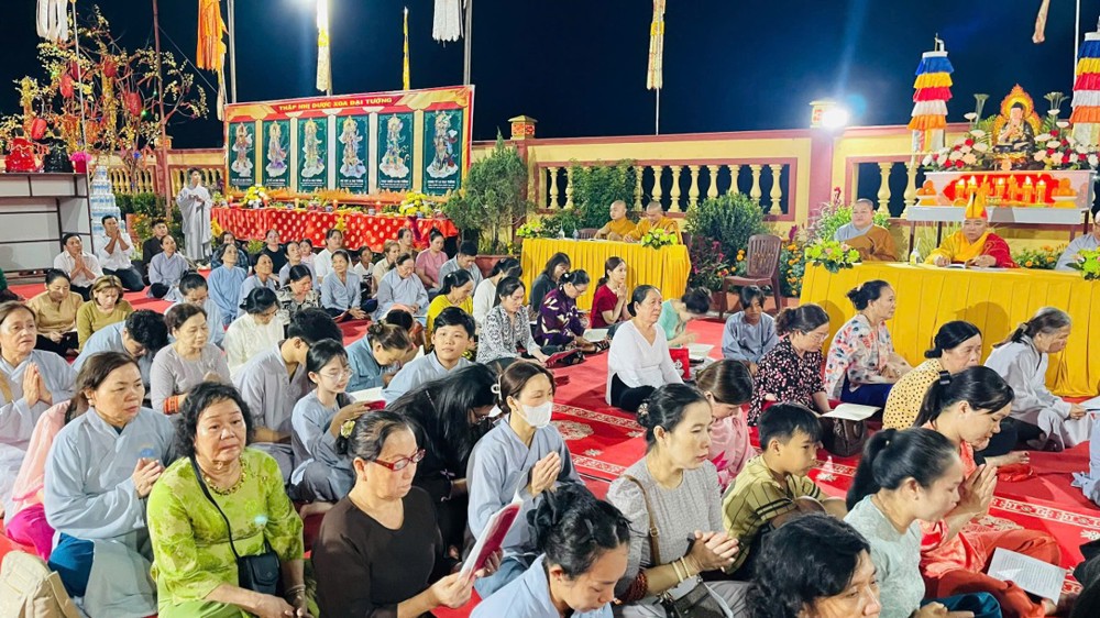 Thời kinh Dược Sư được vang lên, bên ánh đèn lung linh mầu nhiệm, đạo tràng Phật tử dâng tấm lòng thành hướng về chư Phật với tâm thành kính nhất. Pháp hội viên mãn sau phần chú nguyện chúc phúc của Hoà thượng Thích Minh Thành.