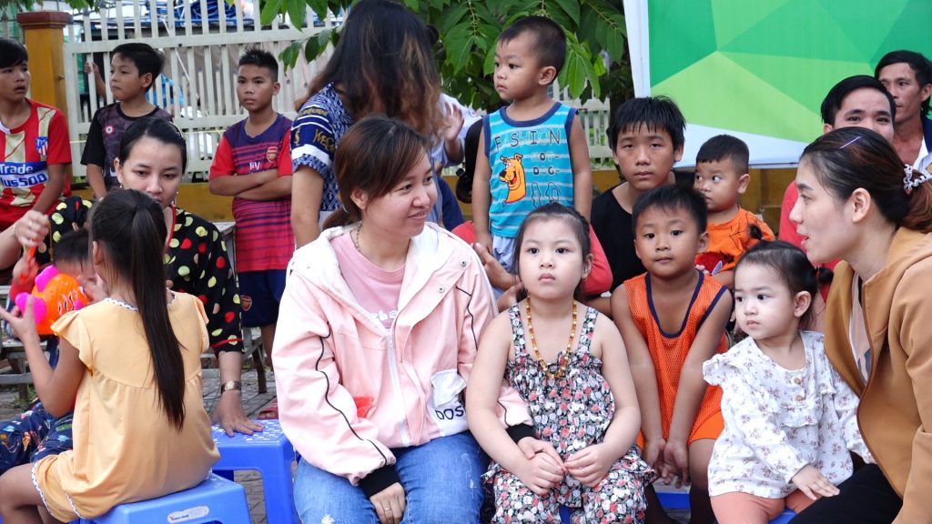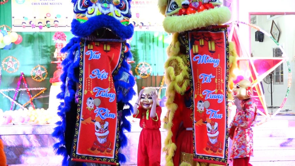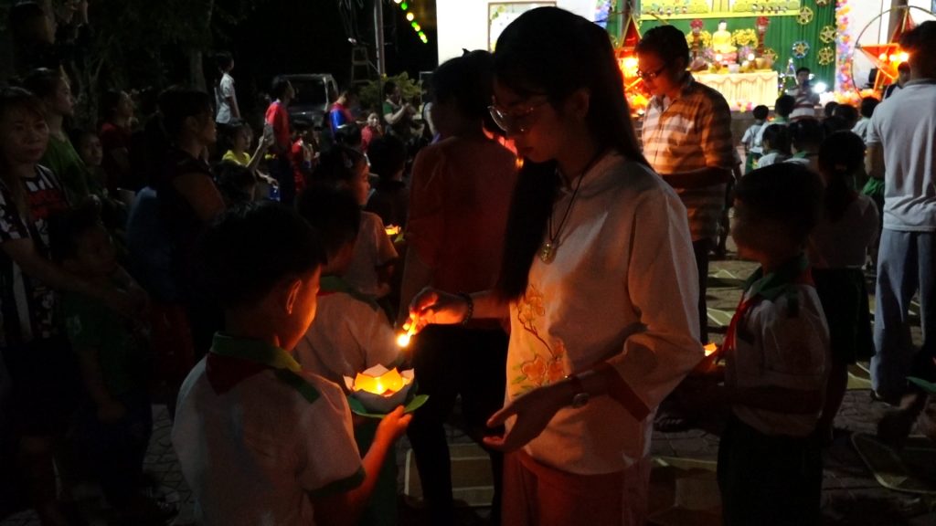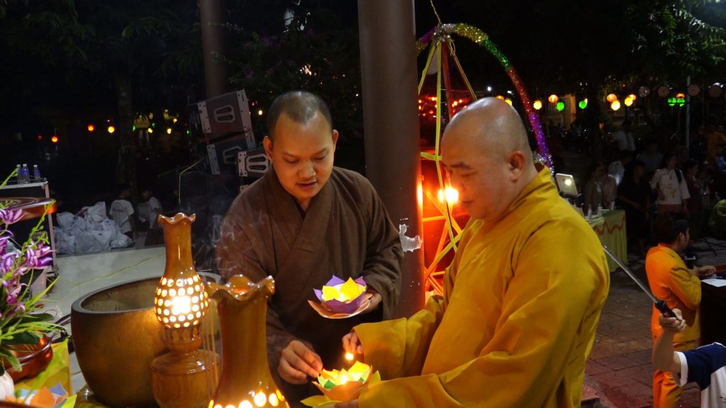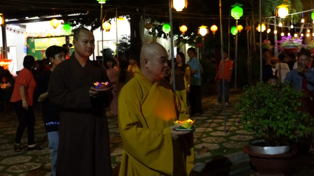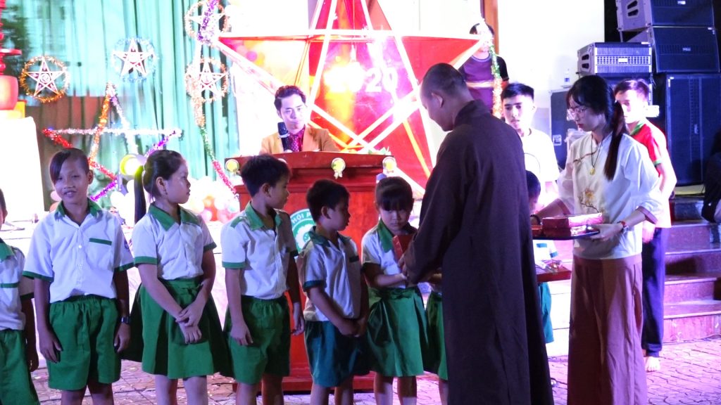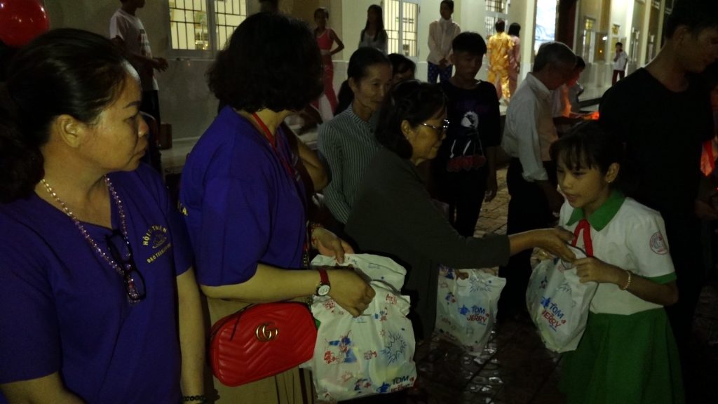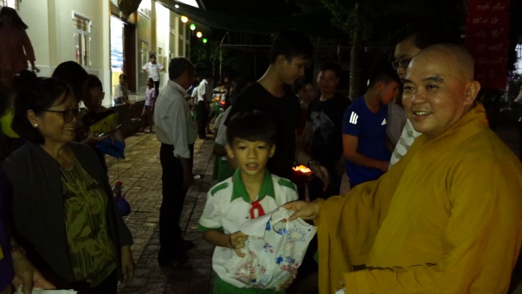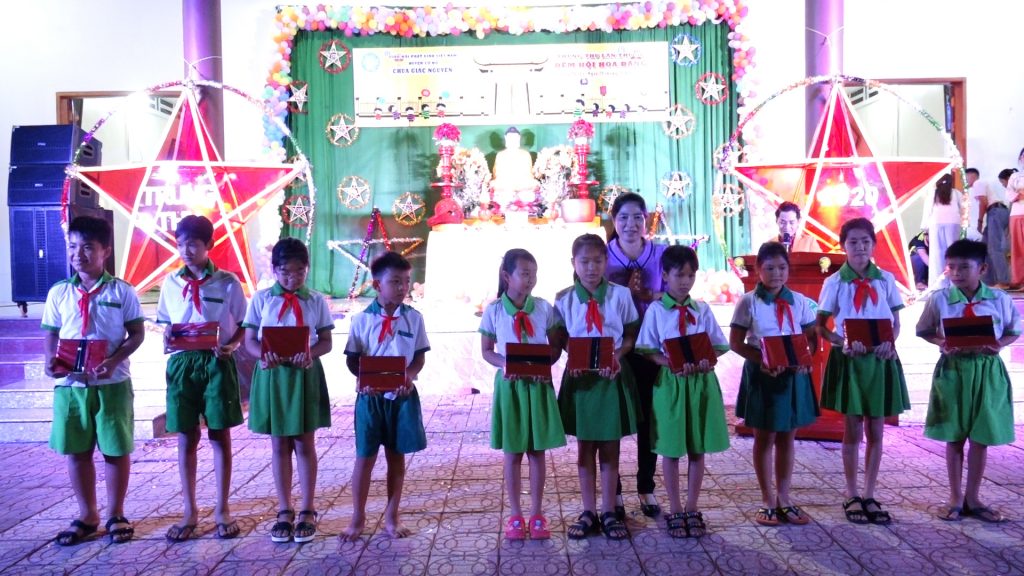 Sau phần thả đèn hoa đăng các em được quý Thầy và quý vị Phật tử đạo tràng trao tặng quà bánh. Trung thu năm nay, chùa Giác Nguyên trao tặng 300 phần quà, gồm bánh, kẹo, lồng đèn trung thu cho các em nhỏ ở địa phương.