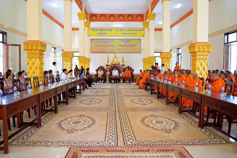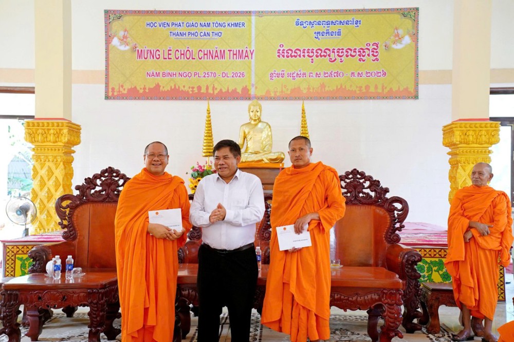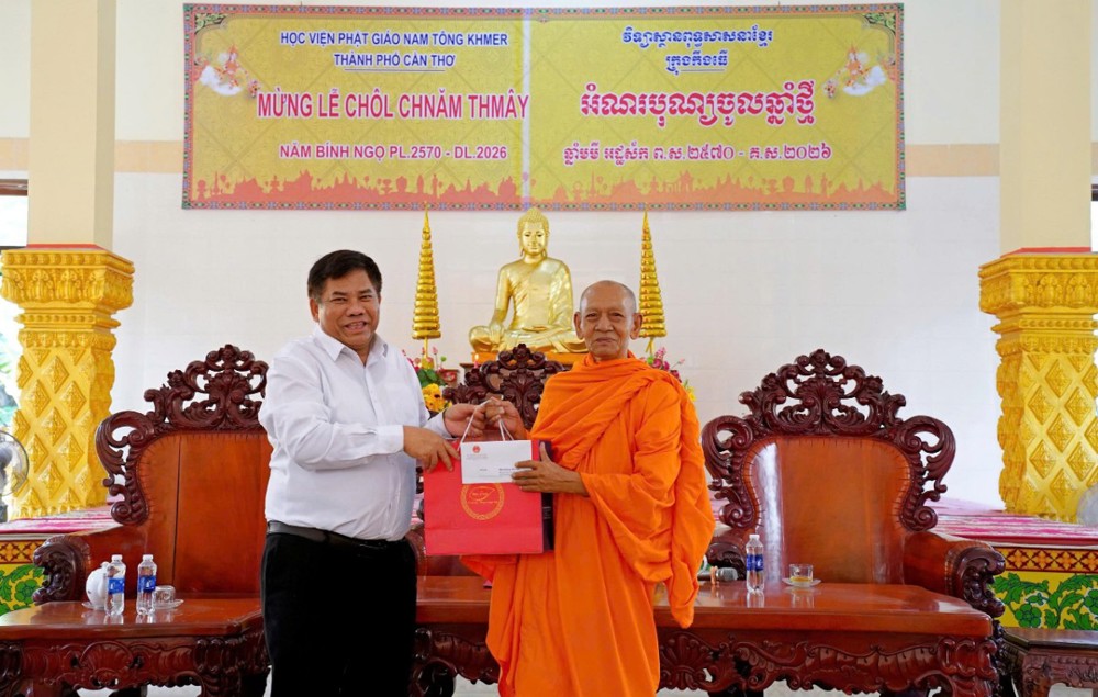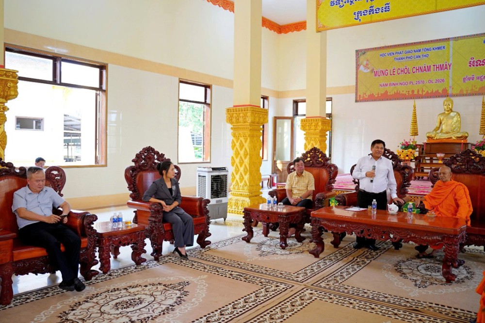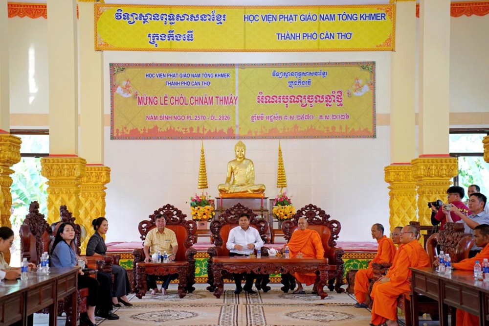 PSO - Nhân dịp Tết cổ truyền Chôl Chnăm Thmây, chiều ngày 12/4/2026, tại Học viện Phật giáo Nam tông Khmer (TP. Cần Thơ) đã trang trọng diễn ra buổi đón tiếp phái đoàn Bộ Dân tộc và Tôn giáo cùng đại diện các cấp đến thăm, chúc mừng đồng bào Khmer.