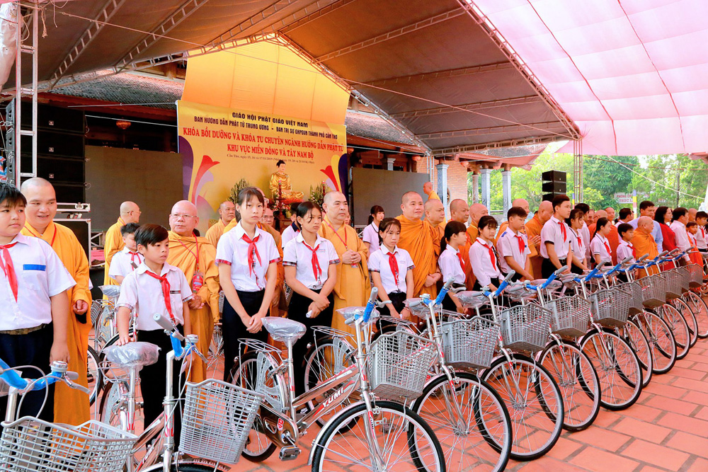 Mở đầu chương trình, chư Tôn đức đã trao tặng 50 chiếc xe đạp cho các em học sinh nghèo, có hoàn cảnh khó khăn tại địa bàn huyện Phong Điền. Được biết, mỗi chiếc trị giá 1.500.000đ (một triệu năm trăm ngàn đồng), với tổng kinh phí là 75.000.000đ (Bảy mươi lăm triệu đồng) nhằm “Tiếp sức đến trường” cho các em học sinh có hoàn cảnh khó khăn, trong đó có nhiều thanh thiếu nhi Phật tử dân tộc. Đó sẽ là món quà hỗ trợ cho các em thuận tiện trên con đường đến trường cũng như khích lệ các em học tập để góp một phần nào đó cho quê hương đất nước trong tương lai.