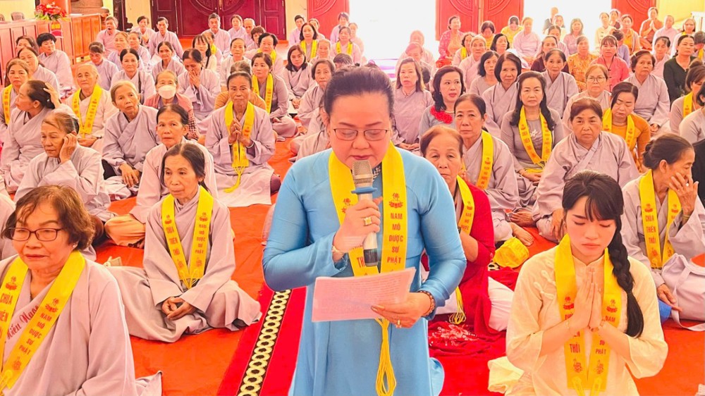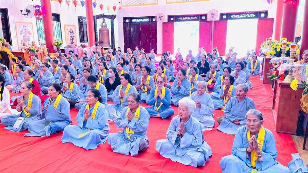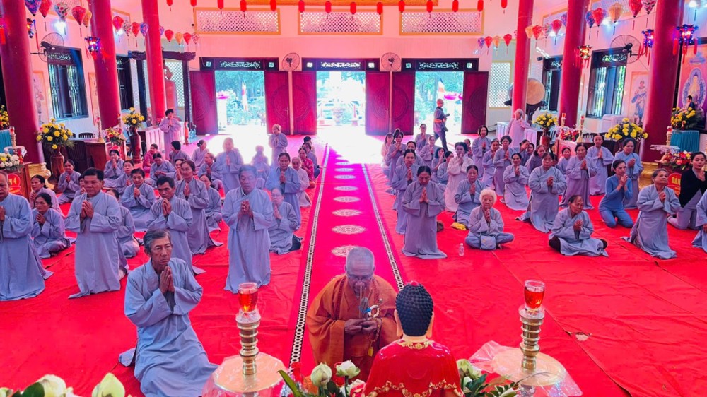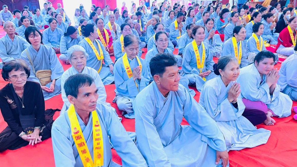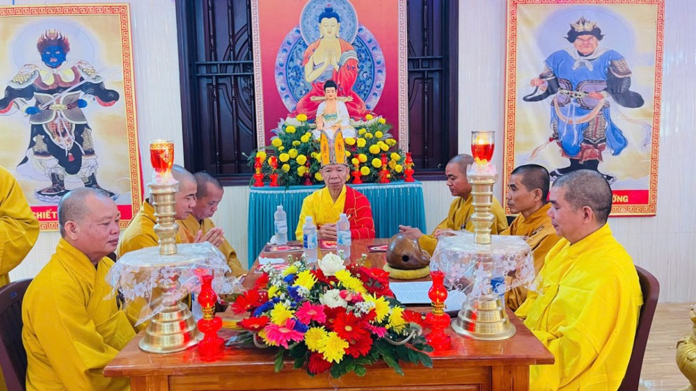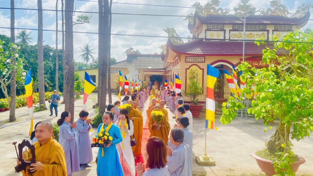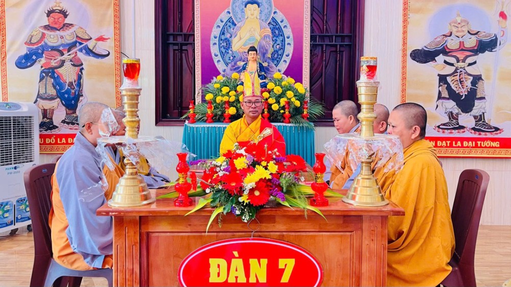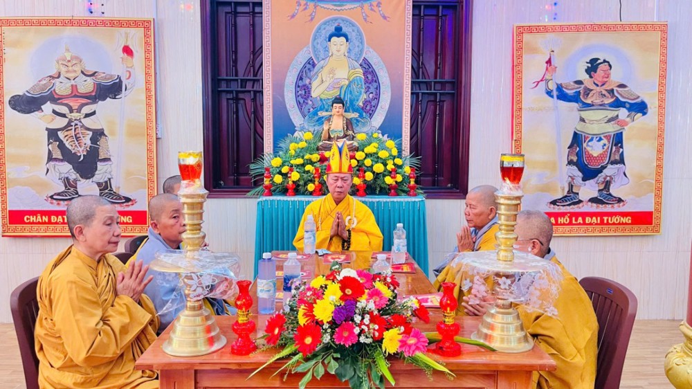 Từ Tổ đường Hoà thượng trụ trì tác pháp thỉnh Tăng quang lâm Pháp hội. Chư tôn đức nguyện hương bạch Phật, đảnh lễ cầu nguyện phong điều vũ thuận, quốc thái dân an. Sau nghi thức, chư tôn đức toạ vị 7 đàn trang nghiêm như pháp. Phật tử Thanh Nhuyến thay mặt đạo tràng dâng lời tác bạch. Hoà thượng Thích Minh Thành ban đạo từ, chúc phúc và tán thán công đức Hoà thượng trụ trì và quý Phật tử chùa Thiên Thới.