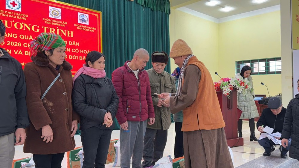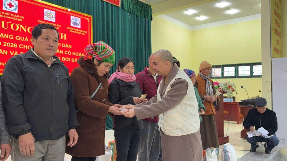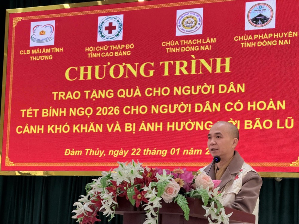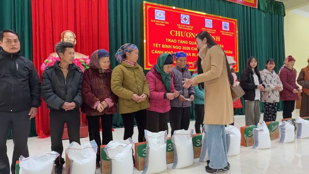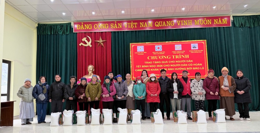 PSO - Nhân dịp chuẩn bị đón Tết cổ truyền của dân tộc, nhằm mang đến chút hơi ấm cho bà con vùng cao, ngày 22/01/2026, được sự kết nối của Hội Chữ thập đỏ tỉnh Cao Bằng và tỉnh Đồng Nai, CLB Mái Ấm Yêu Thương, chùa Thanh Lâm và chùa Pháp Huyền (tỉnh Đồng Nai) đã tổ chức chuyến đi trao tặng 200 phần quà cho 200 hộ đồng bào dân tộc thiểu số tại xã Đàm Thủy, tỉnh Cao Bằng, với tổng trị giá 90 triệu đồng.