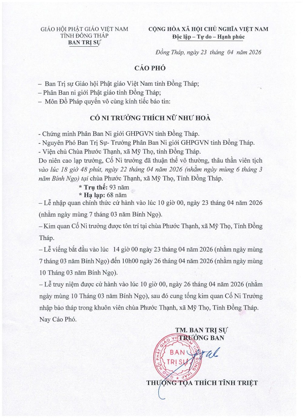 PSO - Thượng tọa Thích Tĩnh Triệt - Ủy viên HĐTS, Trưởng ban Trị sự Giáo hội Phật giáo Việt Nam tỉnh Đồng Tháp vừa ký Cáo phó báo tin: Ni trưởng THÍCH NỮ NHƯ HÒA, Chứng minh PBNG Phật giáo tỉnh Đồng Tháp, Viện chủ chùa Phước Thạnh vừa viên tịch.