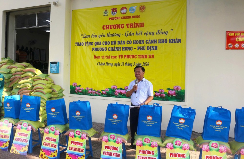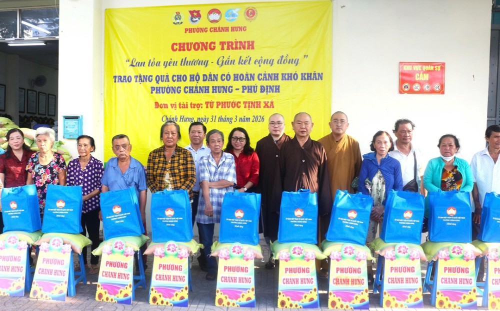 PSO - Nhằm chào mừng Đại hội đại biểu Phật giáo TP.HCM lần thứ I, ngày 31/3/2026, chư Tôn đức Phật giáo người Hoa đã phối hợp cùng chính quyền phường Chánh Hưng tổ chức chương trình “Lan tỏa yêu thương – Gắn kết cộng đồng”, trao quà đến các hộ dân có hoàn cảnh khó khăn trên địa bàn phường Chánh Hưng và phường Phú Định.