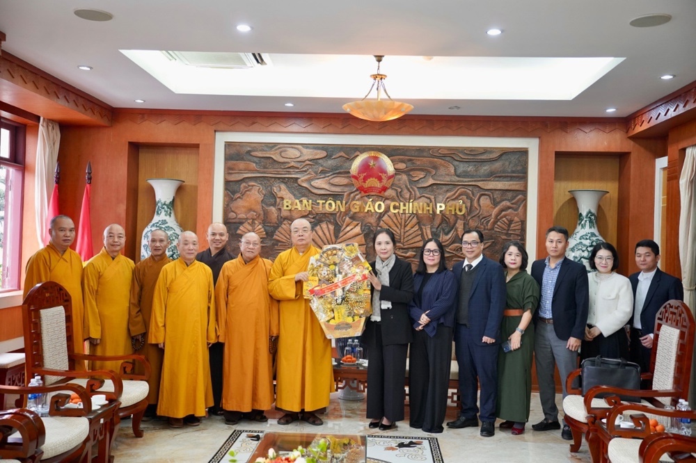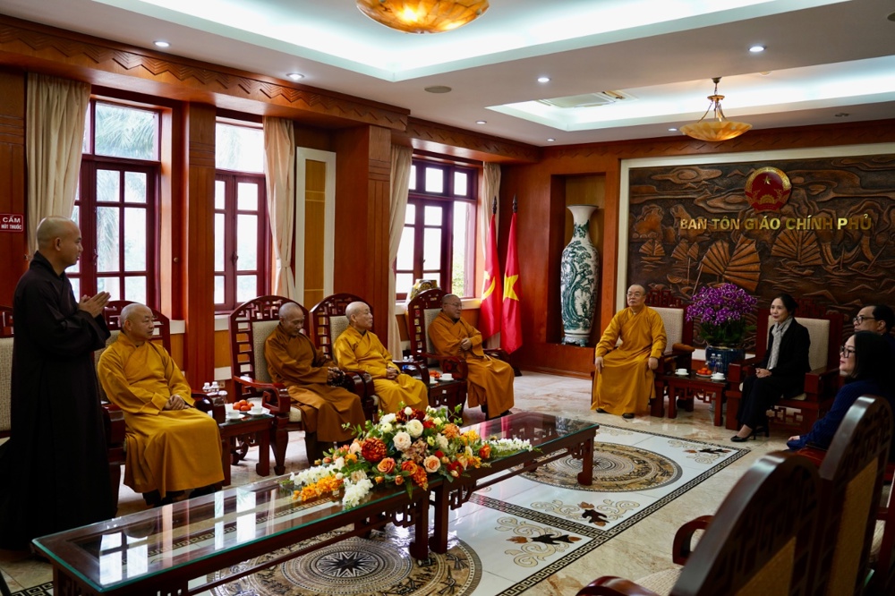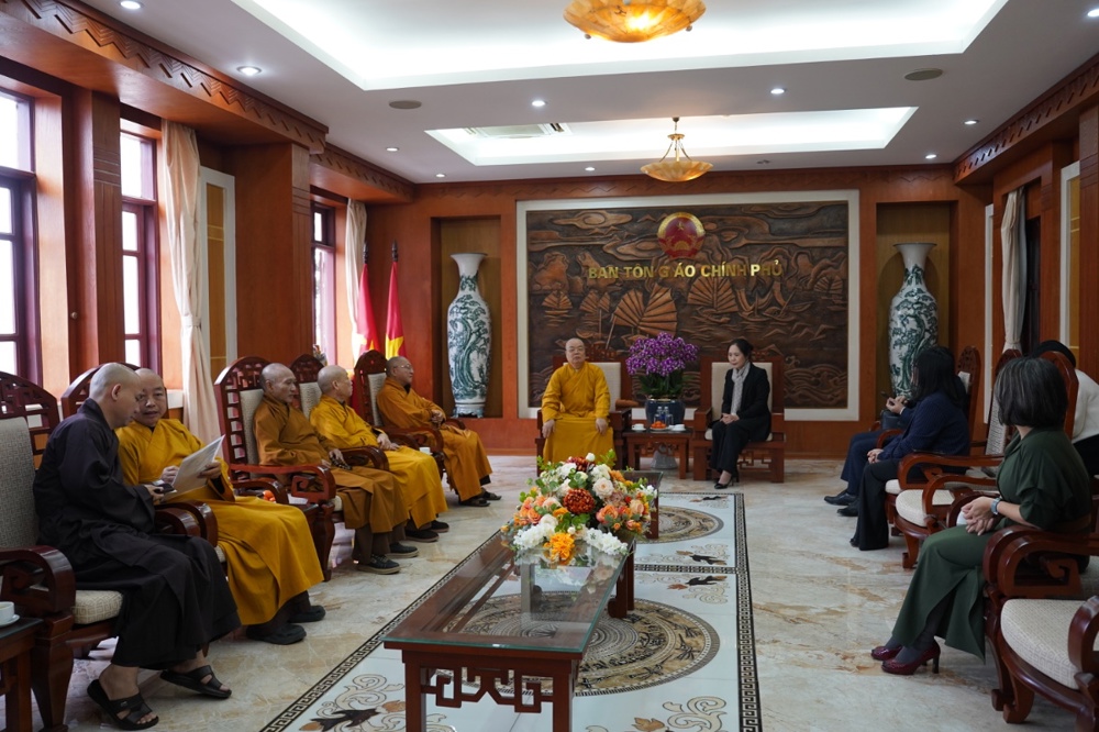 Tiếp đoàn tại Ban Tôn giáo Chính Phủ có Bà Trần Thị Minh Nga, Phó Trưởng ban Tôn giáo Chính phủ, ông Cát Ngọc Trình, Trưởng phòng Phật giáo ban Tôn giáo Chính phủ và các chuyên viên Ban Tôn giáo Chính phủ thân mật đón tiếp đoàn.
