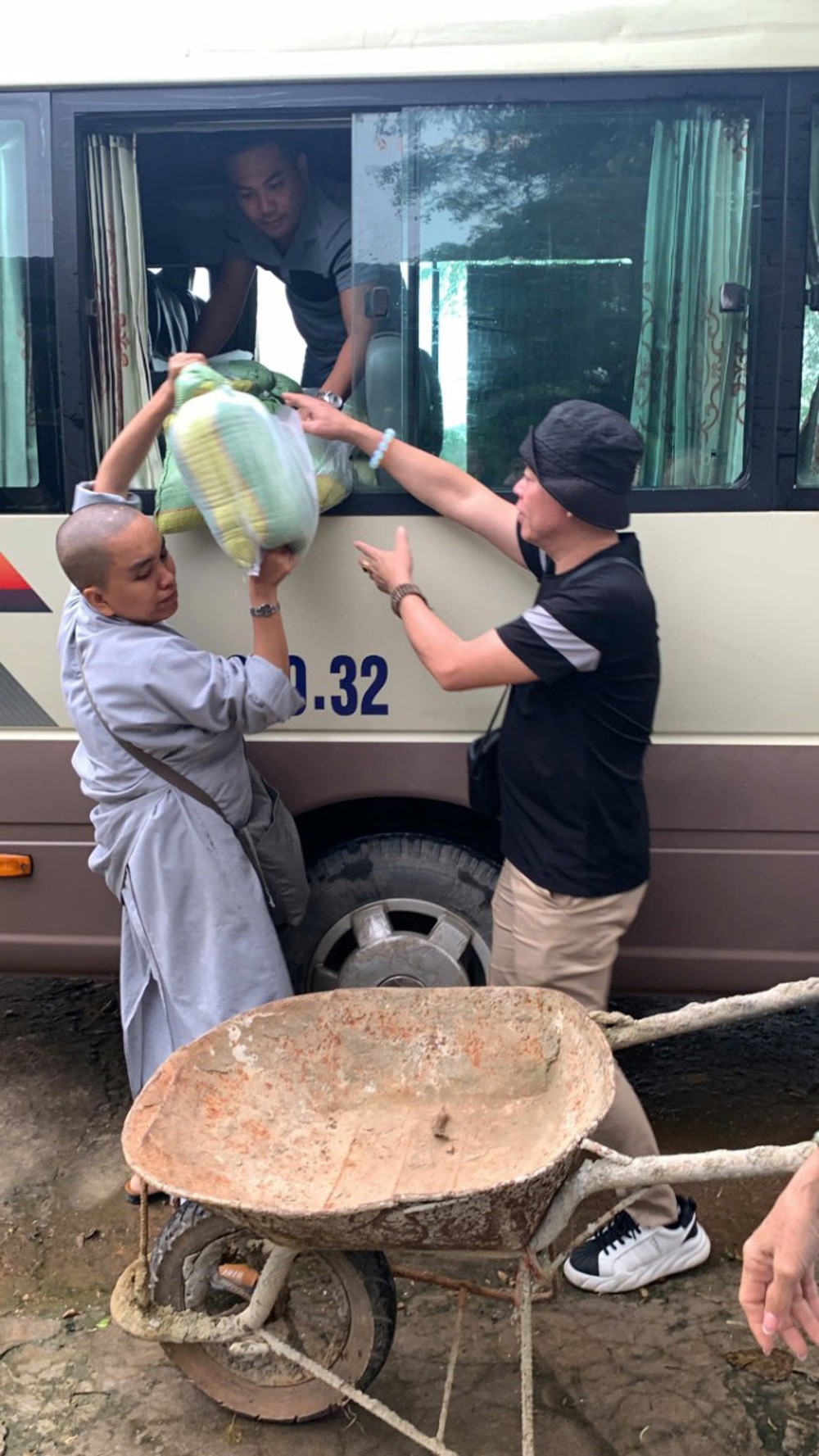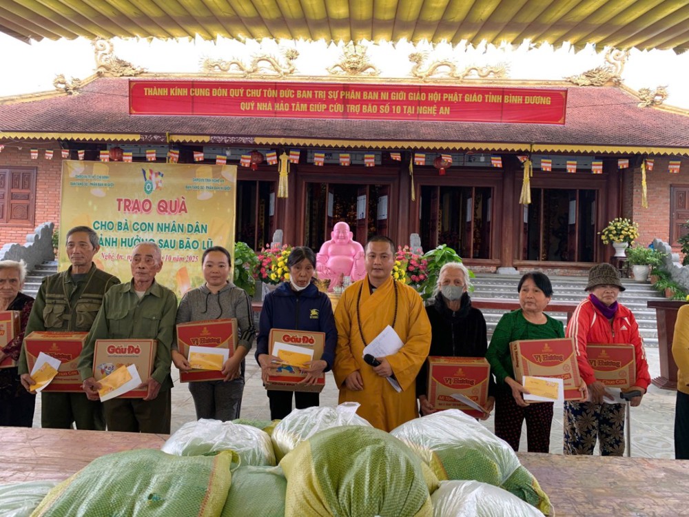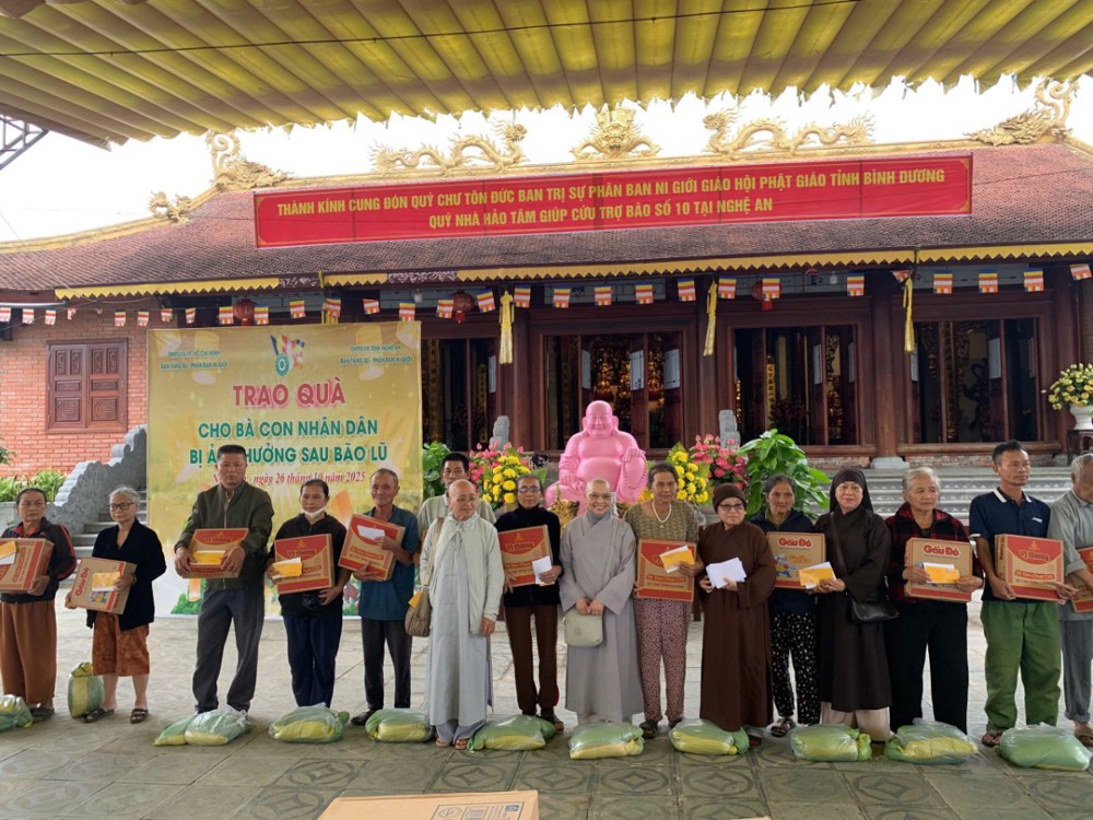 Tại Chùa Vịnh, Can Lộc, Hà Tĩnh chia sẻ yêu thương với 30 phần đến bà con bị ảnh hưởng bởi những trận bão lũ vừa qua. Và điểm cuối cùng của chuyến đi, đoàn trao 100 suất quà chứa đựng lòng từ bi, hơi ấm của tình đồng bào mà chư Tôn đức Ni Phân ban Ni giới khu vực Bình Dương cũ muốn gửi trao – để trong gian khó, bà con vẫn thấy được ánh sáng của tình người, mỗi phần trị giá 1.200.000 đồng tại Chùa Phúc Cung xã Trung Phúc Cường, huyện Thiên Nhẫn cũ, Nghệ An.