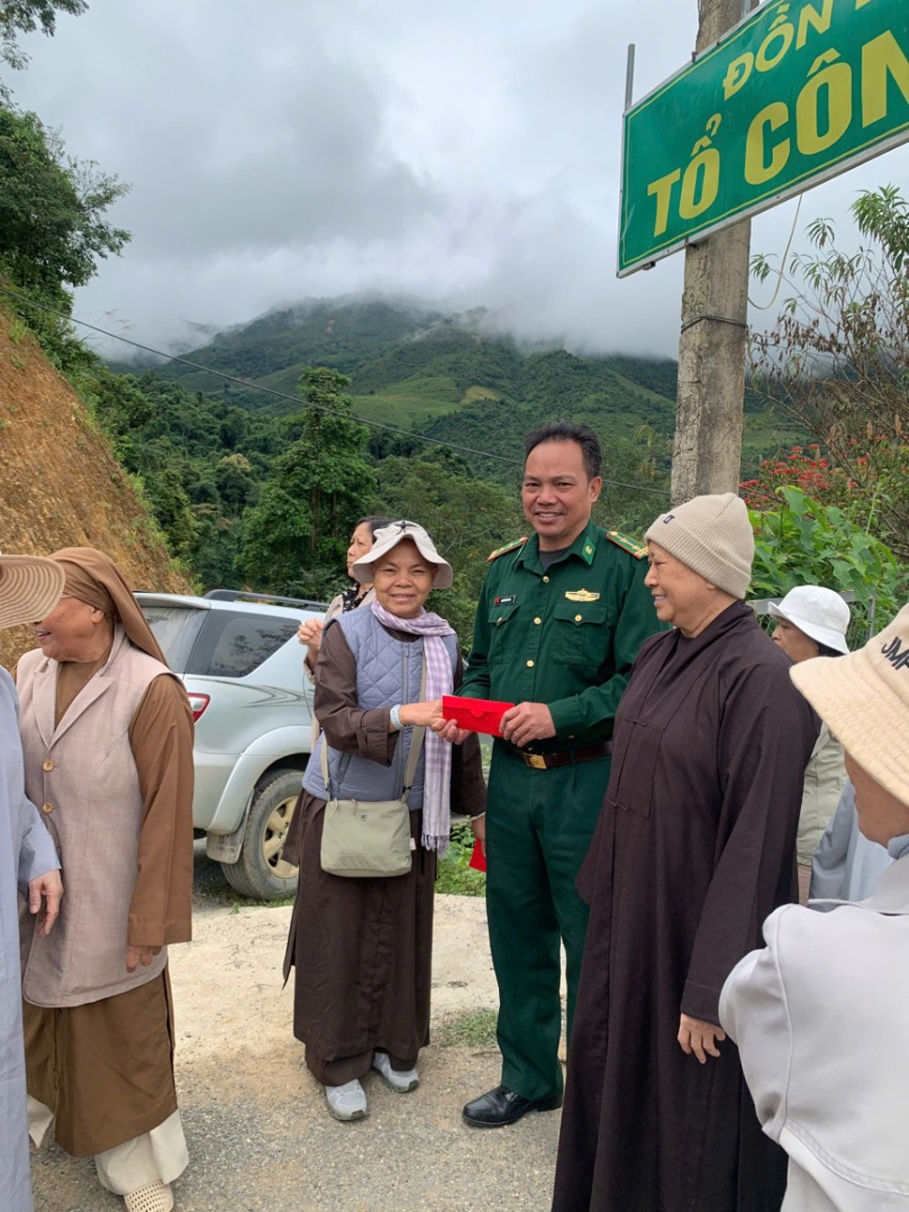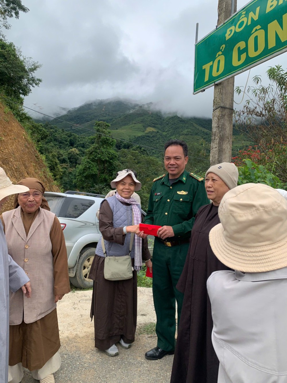 Chiều 24/10, tại Bảng Tiền Tiêu, Nậm Cắn, Kỳ Sơn, tỉnh Nghệ An chư Tôn đức Ni đã thăm hỏi và trao tặng 150 suất quà (mỗi suất gồm 700 ngàn đồng và 01 phong bì tiền mặt 500 ngàn) tới các gia đình có hoàn cảnh khó khăn sau cơn bão lũ. Nhân đây, đoàn đã tặng Biên phòng Nậm Cắn 01 tủ lạnh 280 lít trị giá 4.500.000 đồng.