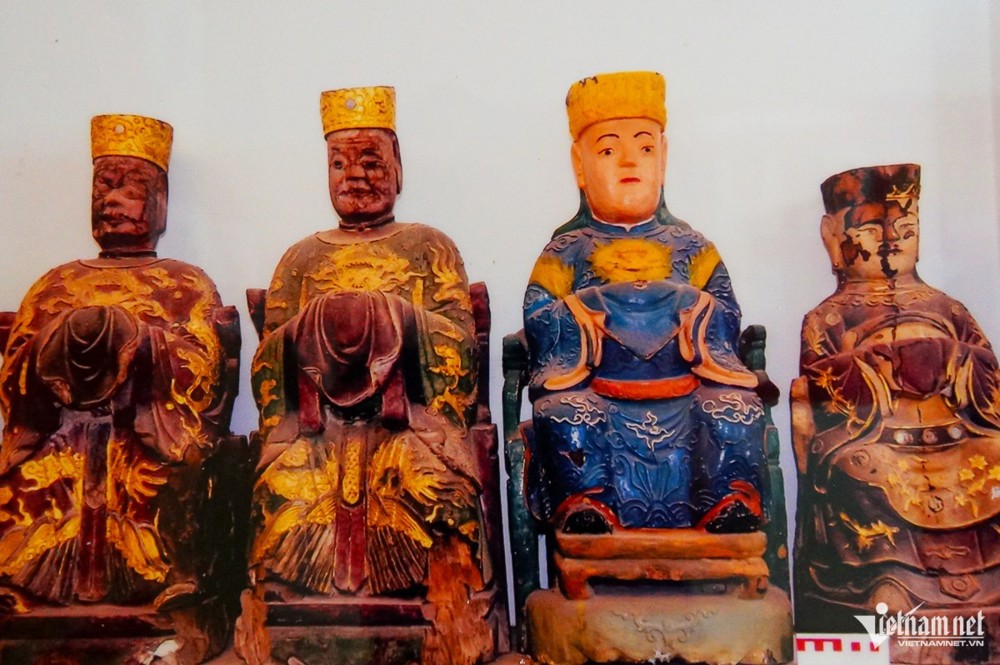 Các tượng được làm bằng gỗ, sơn thếp, tạo hình nhân vật mặc long bào hoặc quan phục có chạm khắc rồng, hạc, mây lửa - biểu tượng đặc trưng cho quyền uy và tín ngưỡng dân gian.