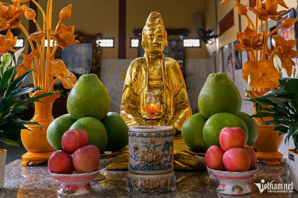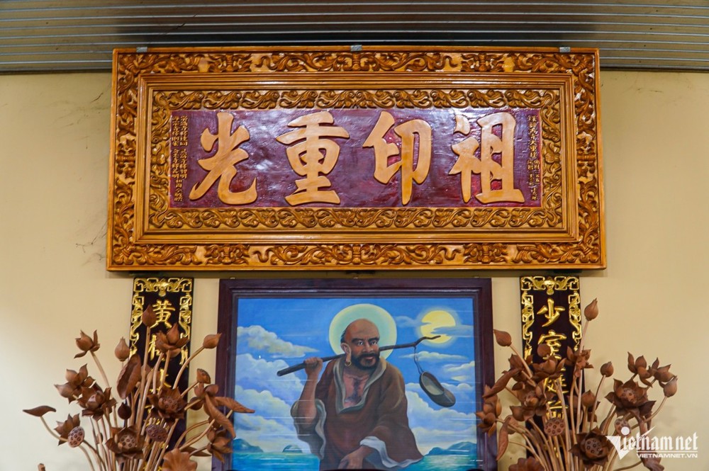 Pho tượng Tổ sư được đặt trang trọng giữa bàn thờ được sơn thếp vàng, khuôn mặt hiền từ, nét khắc tinh tế.
