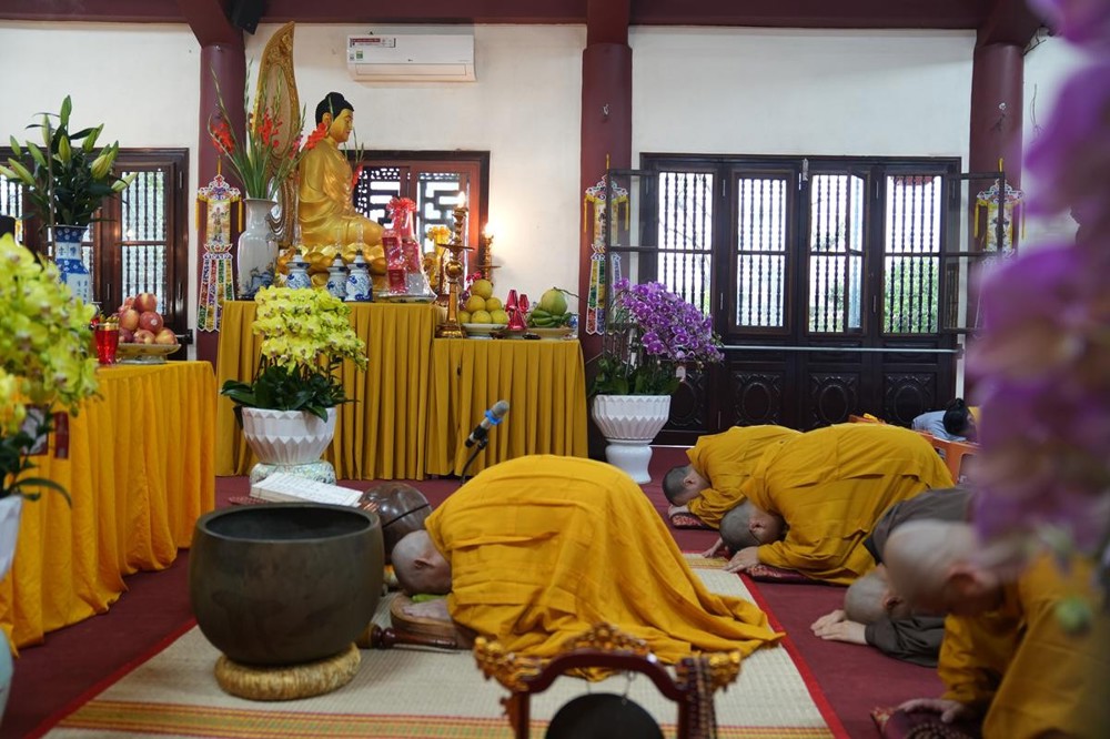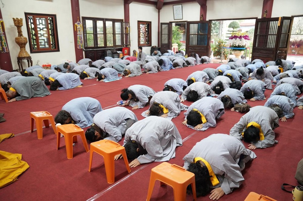 Sau khi cung thỉnh quyển Kinh và hòm kinh cổ hàng trăm năm tuổi an trí nơi giảng đường, dưới sự hướng dẫn của chư tôn đức Tăng, toàn thể đại chúng đồng thanh xưng niệm hồng danh chư Phật, chí thành lễ bái trong tiếng chuông mõ hòa điệu, nhịp nhàng, trầm hùng. Mỗi lạy là một lần phản quan tự kỷ, mỗi danh hiệu Phật được xưng niệm là một lần đánh thức Phật tính sẵn có nơi tự tâm.