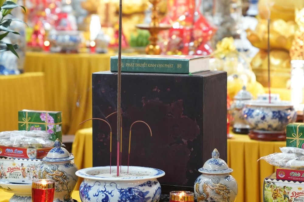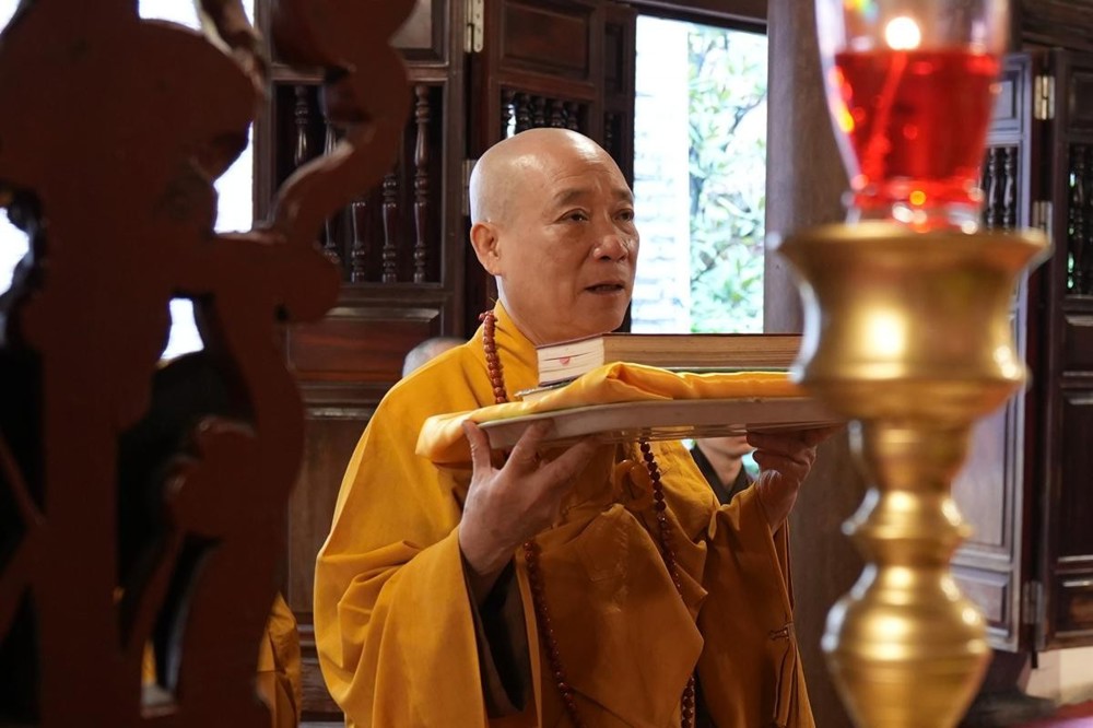 Sau nghi thức cung rước hòm kinh Vạn Phật cổ từ nhà Pháp Bảo, Hòa thượng trụ trì Thích Bảo Nghiêm đã thực hiện nghi thức niêm hương bạch Phật, yết Tổ và chính thức cử hành nghi lễ khai kinh trong không khí thanh tịnh, trang nghiêm.