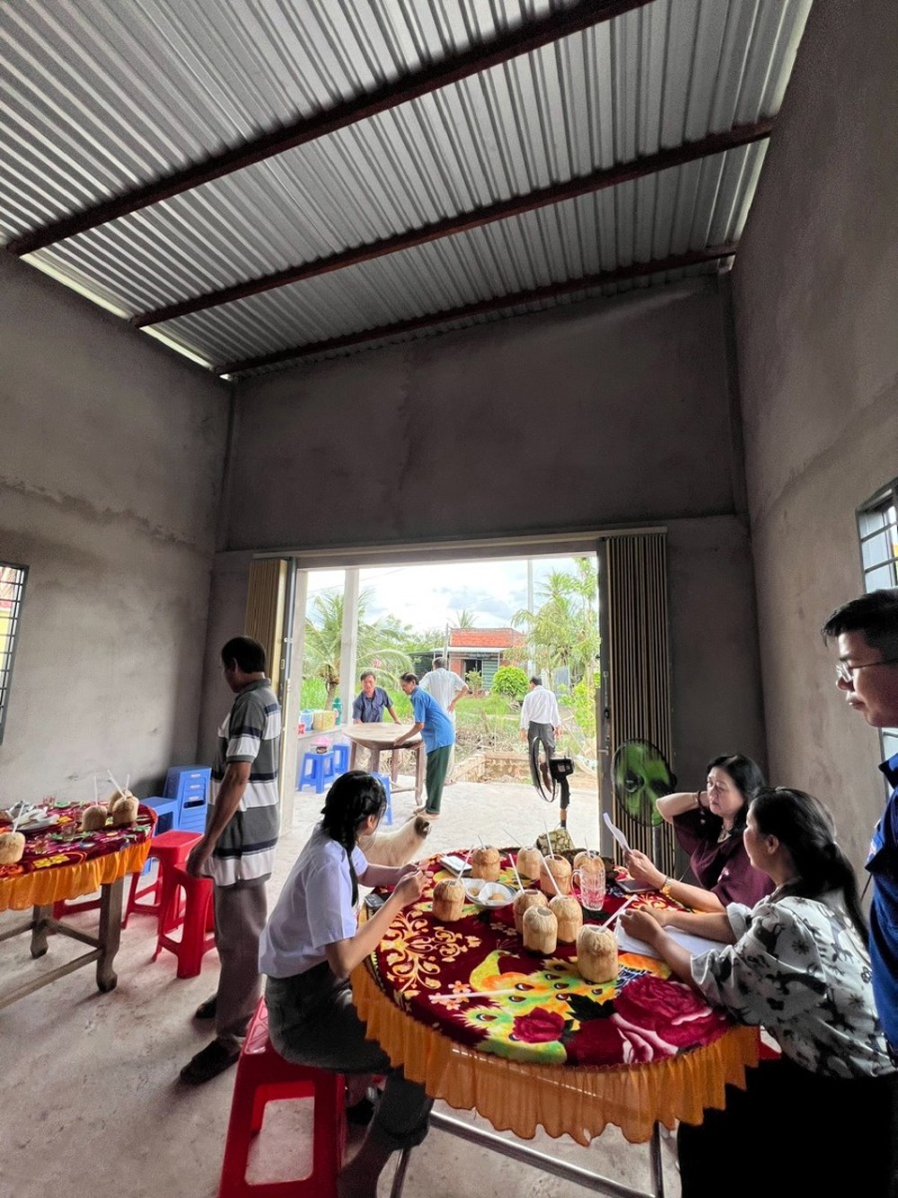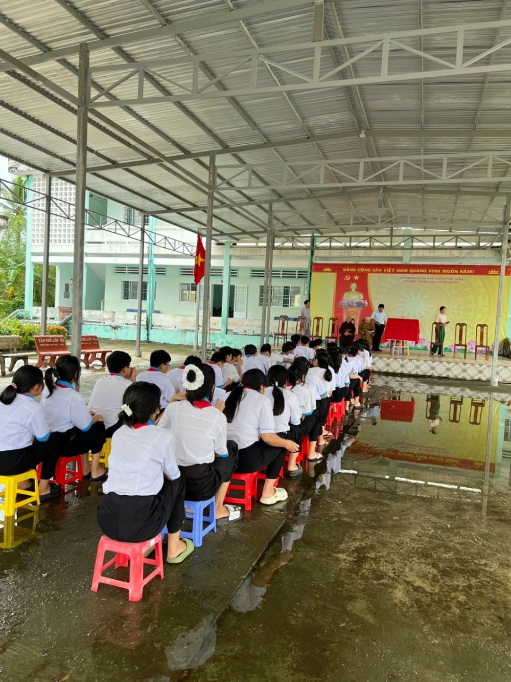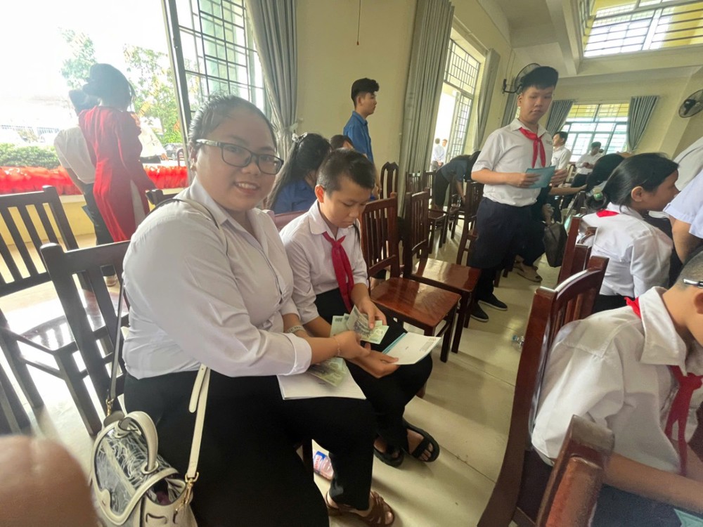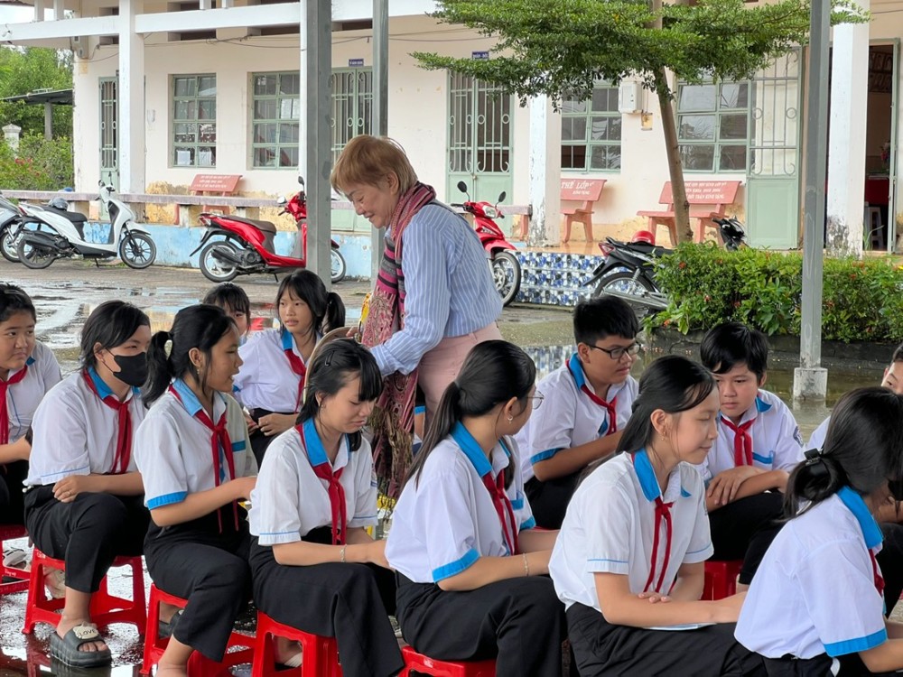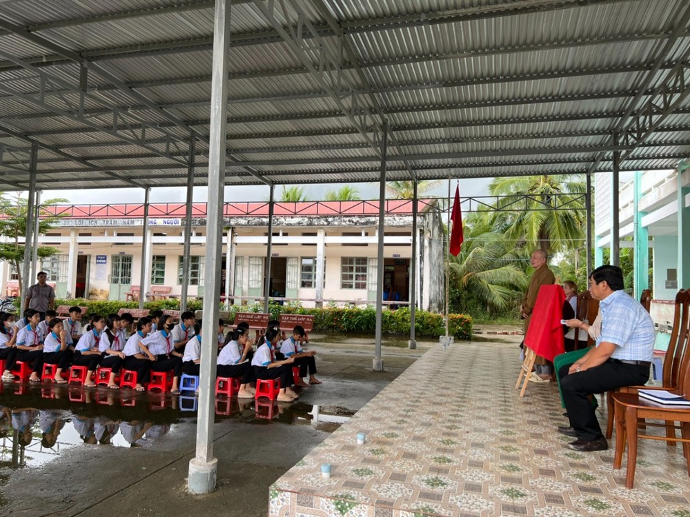 Không chỉ chăm lo đời sống vật chất, đoàn còn quan tâm đến sự nghiệp giáo dục, khi bàn giao mái che sân trường cho Trường Trung học Cơ sở Lợi An (xã Lương Thế Trân, tỉnh Cà Mau).