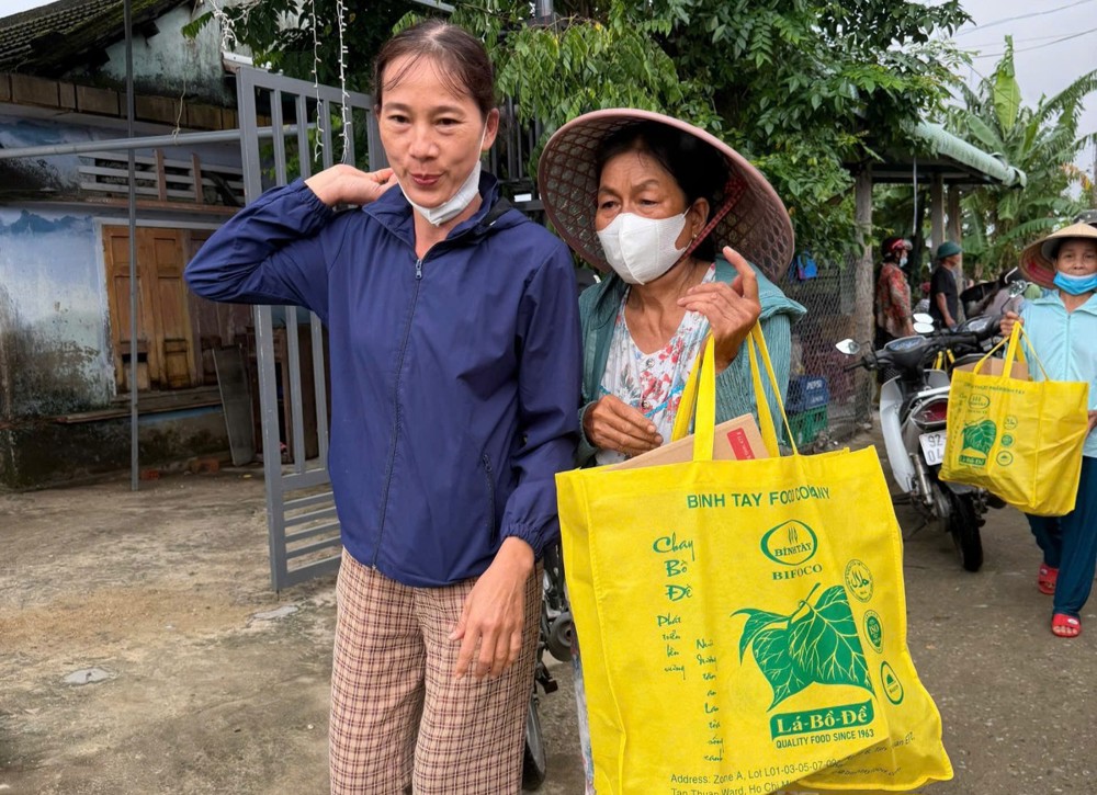 Mỗi phần quà bao gồm các nhu yếu phẩm thiết yếu, thực phẩm khô, dầu gió và thuốc, nhằm giúp bà con phần nào ổn định cuộc sống sau những ngày mưa bão.