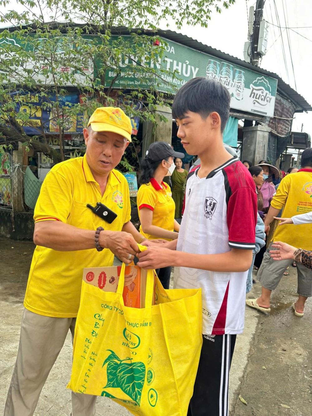Cùng ngày, đoàn tiếp tục đến xóm Nam Sơn, thôn Kim Sơn, xã Duy Trinh, trao tặng 150 phần quà hỗ trợ cho các hộ dân chịu thiệt hại nặng.