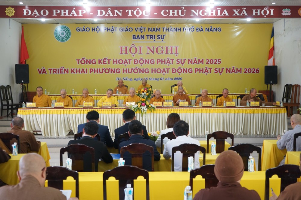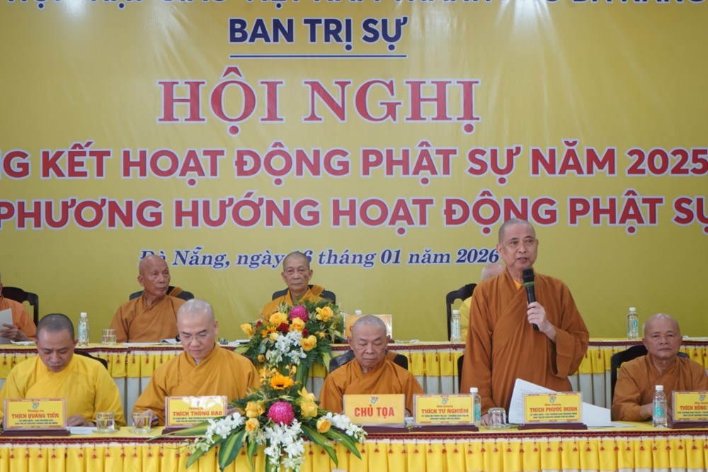 Thượng tọa Thích Thanh Bảo – Phó thư ký, Chánh văn phòng Ban Trị sự thành phố đã đọc báo cáo tổng kết hoạt động Phật sự năm 2025. Theo báo cáo, Ban Trị sự GHPGVN thành phố Đà Nẵng mới có 13 vị chứng minh Ban Trị sự, 09 vị chứng minh Phân ban Ni giới và 122 thành viên Ban Trị sự do Hòa thượng Thích Từ Nghiêm giữ chức vụ Trưởng Ban Trị sự GHPGVN TP. Đà Nẵng; Hòa thượng Thích Phước Minh, Thượng tọa Thích Thông Đạo giữ chức vụ Phó trưởng ban Thường trực Ban Trị sự và Thượng tọa Thích Viên Trừng giữ chức vụ Phó Trưởng ban kiêm Chánh Thư ký Ban Trị sự. Thành phần nhân sự Ban Trị sự sau khi sáp nhập đã được Chủ tịch Hội đồng Trị sự GHPGVN chuẩn y tại quyết định 333/QĐ-HĐTS ngày 30/6/2025. Trụ sở của Ban Trị sự đặt tại chùa Pháp Lâm, số 574 đường Ông Ích Khiêm, phường Hải Châu, thành phố Đà Nẵng.
