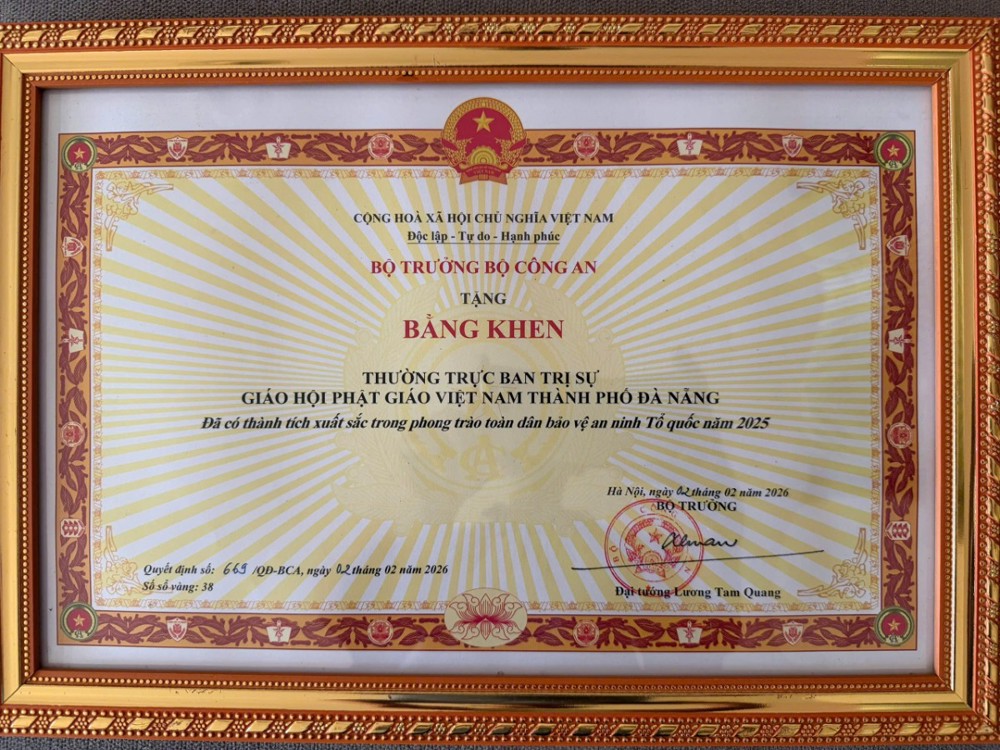 Thường trực Ban Trị sự GHPGVN Tp Đà Nẵng vinh dự là 1 trong 7 tập thể được tặng bằng khen của Bộ trưởng Bộ Công an. Thượng tọa Thích Thông Đạo - Ủy viên HĐTS, Phó trưởng ban Thường trực Ban Trị sự GHPGVN Tp Đà Nẵng đã thay mặt Thường trực Ban trị sự thành phố đón nhận bằng khen.