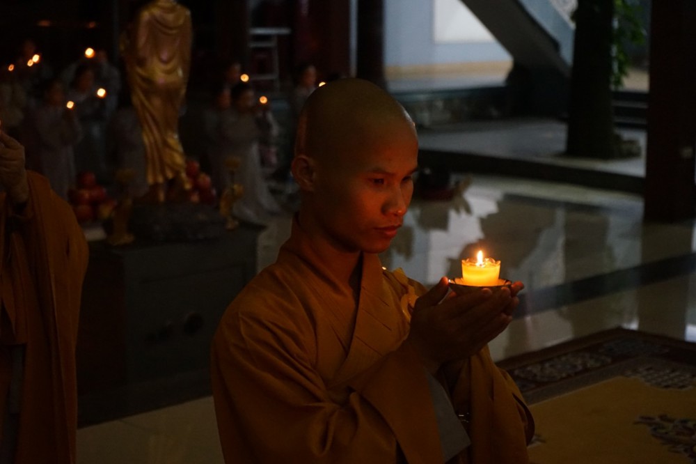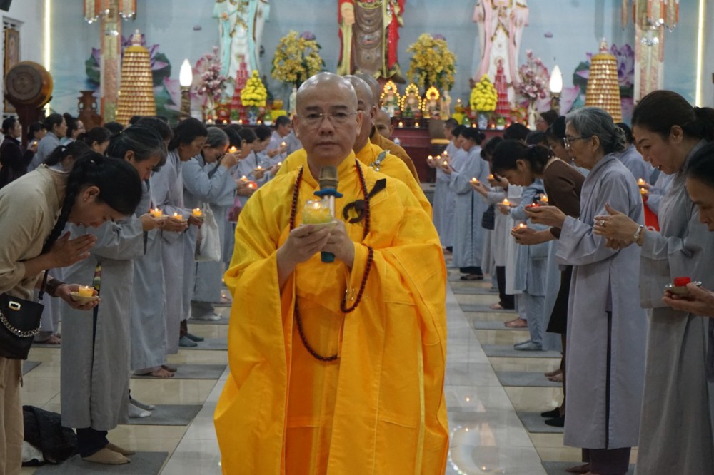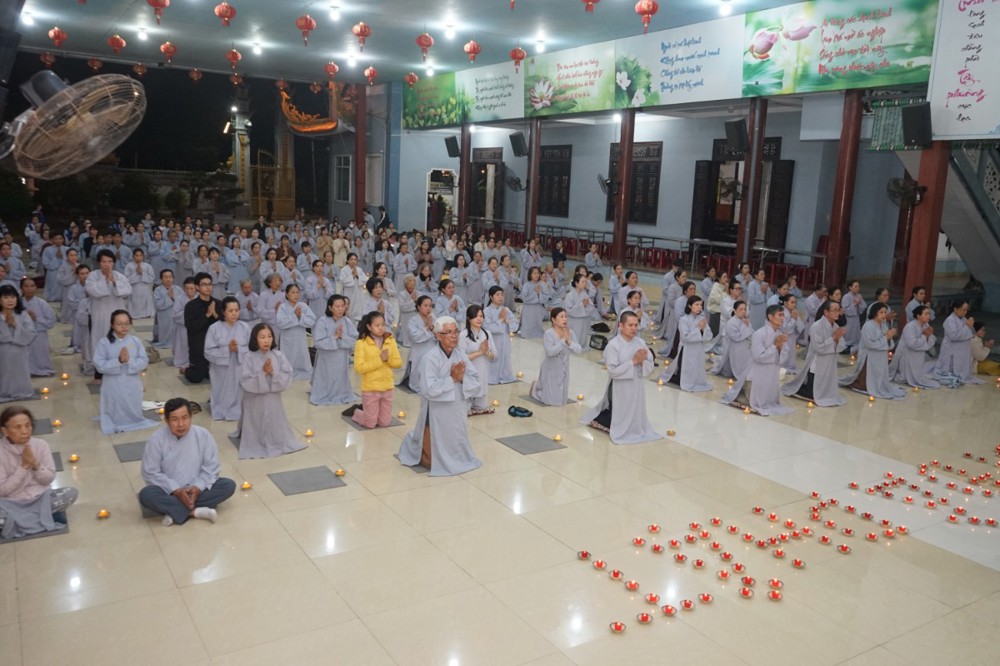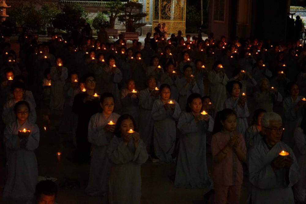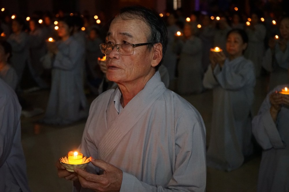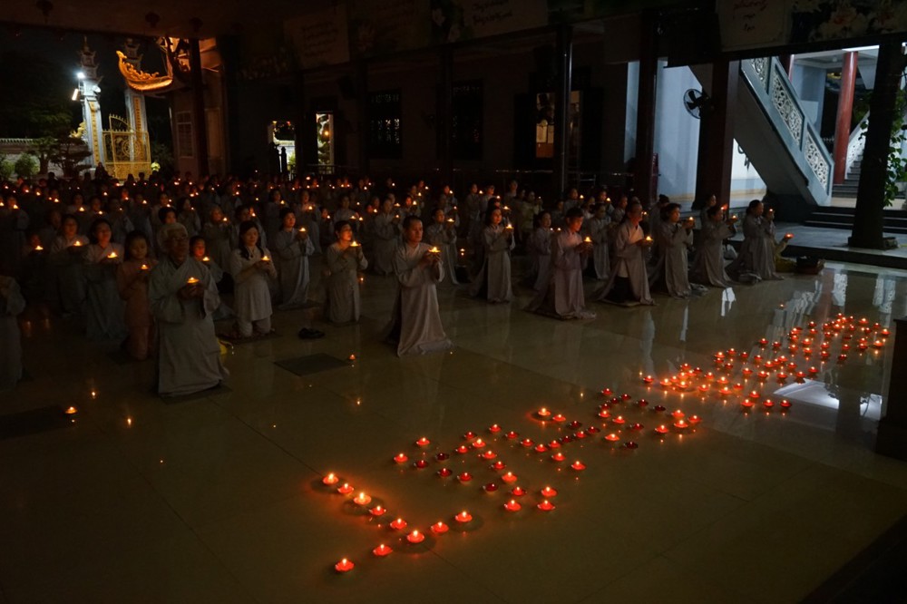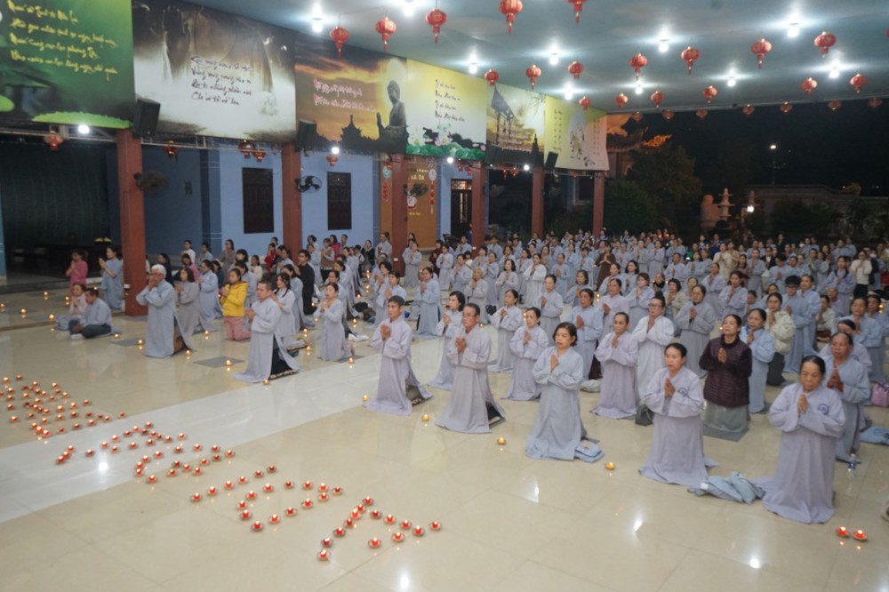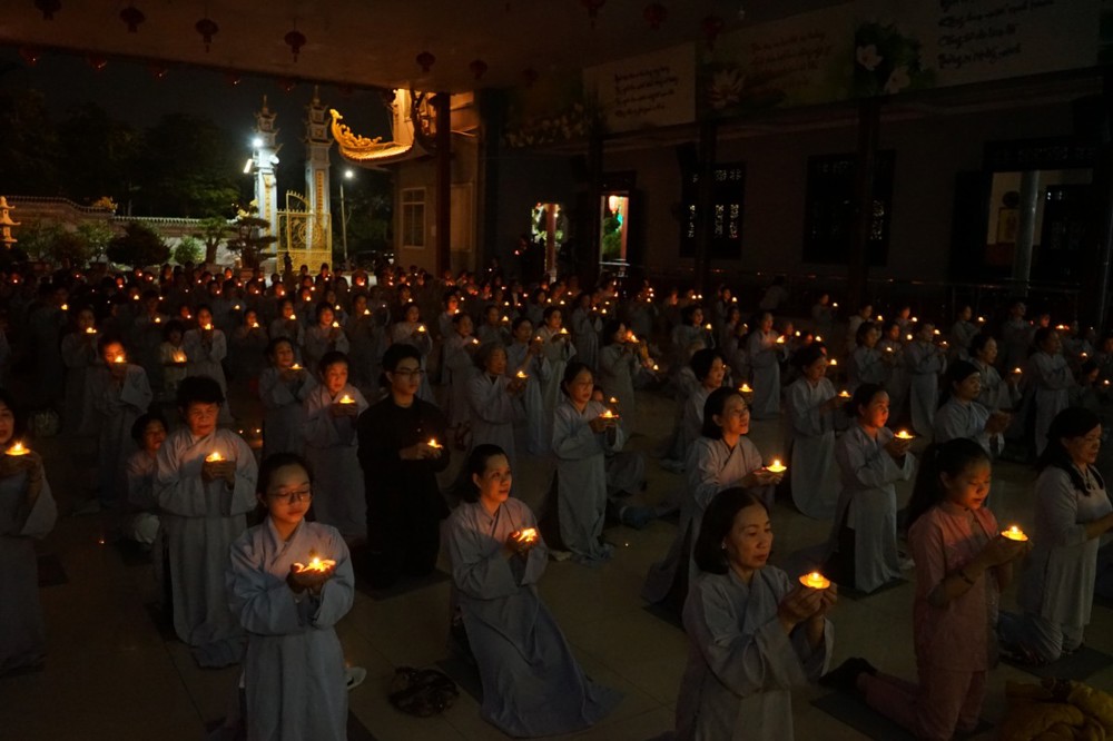 Trong đêm tối, những ngọn nến được dâng lên cúng dường Đức Phật A Di Đà, thắp sáng Diệu Pháp Đường chùa Bà Đa, là tấm lòng của những người con Phật hướng về Đức Từ phụ, nguyện một dạ chí thành hành trì pháp môn Tịnh độ để theo Ngài về cõi an lành.
