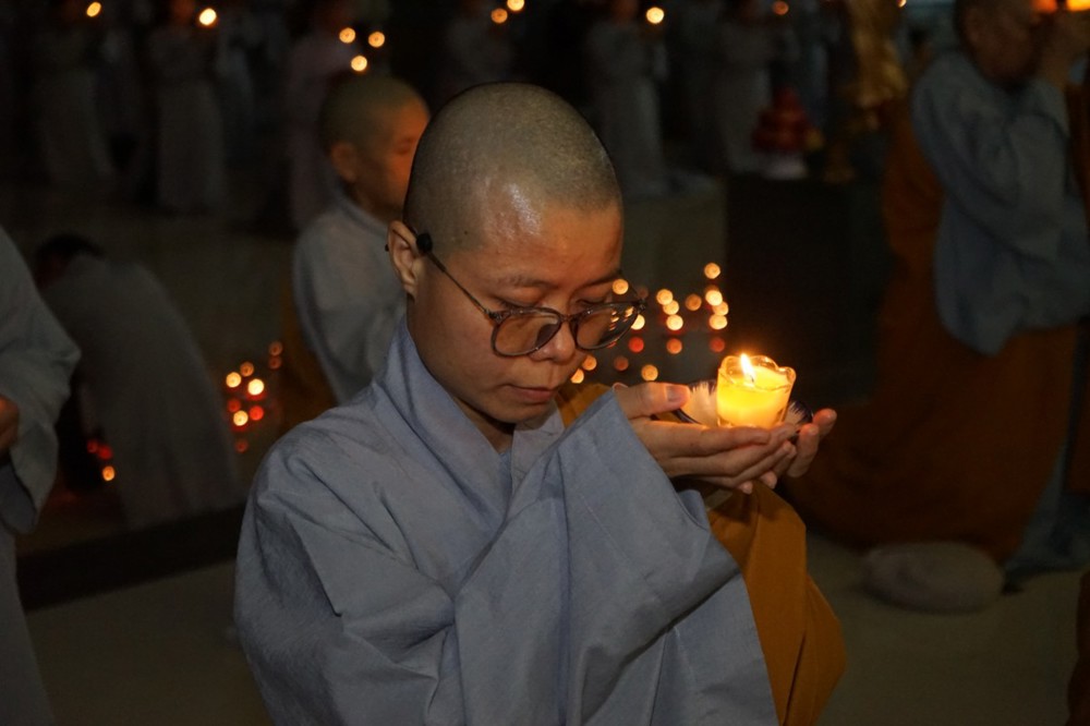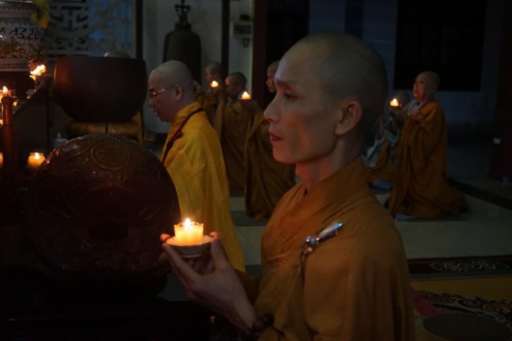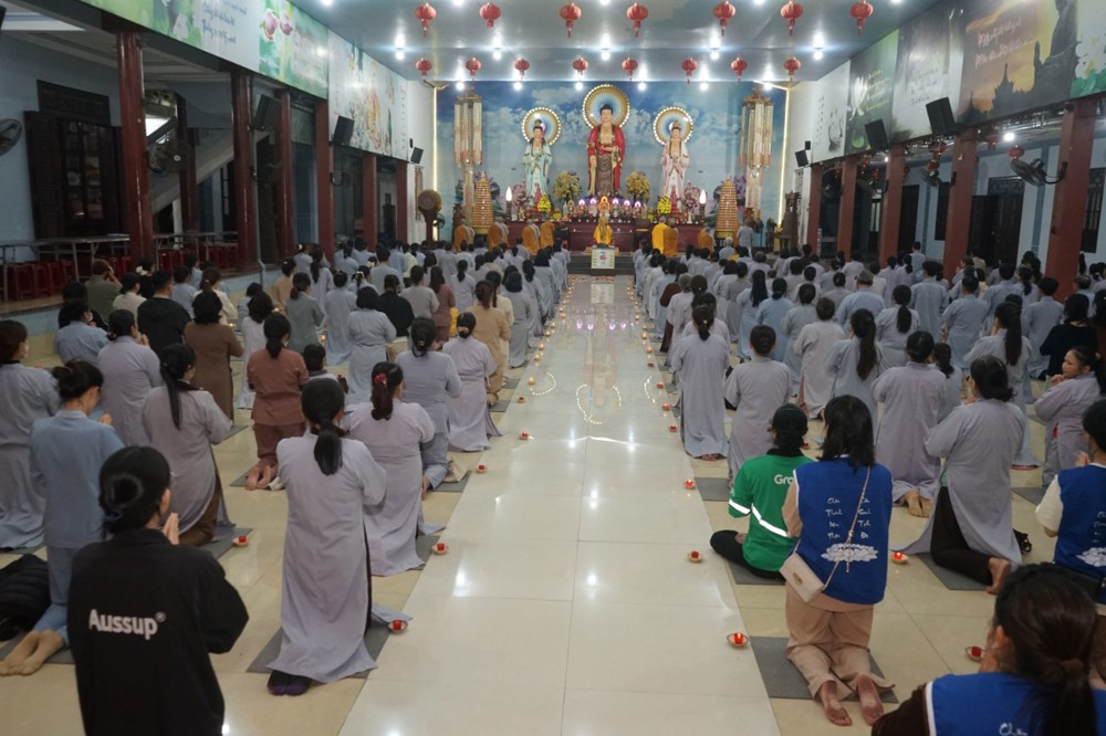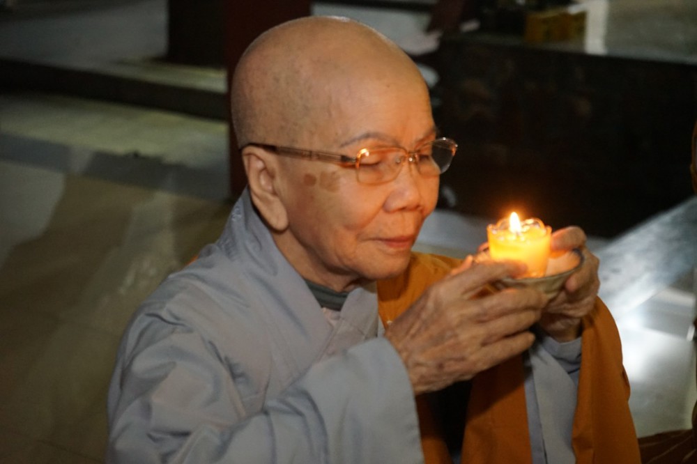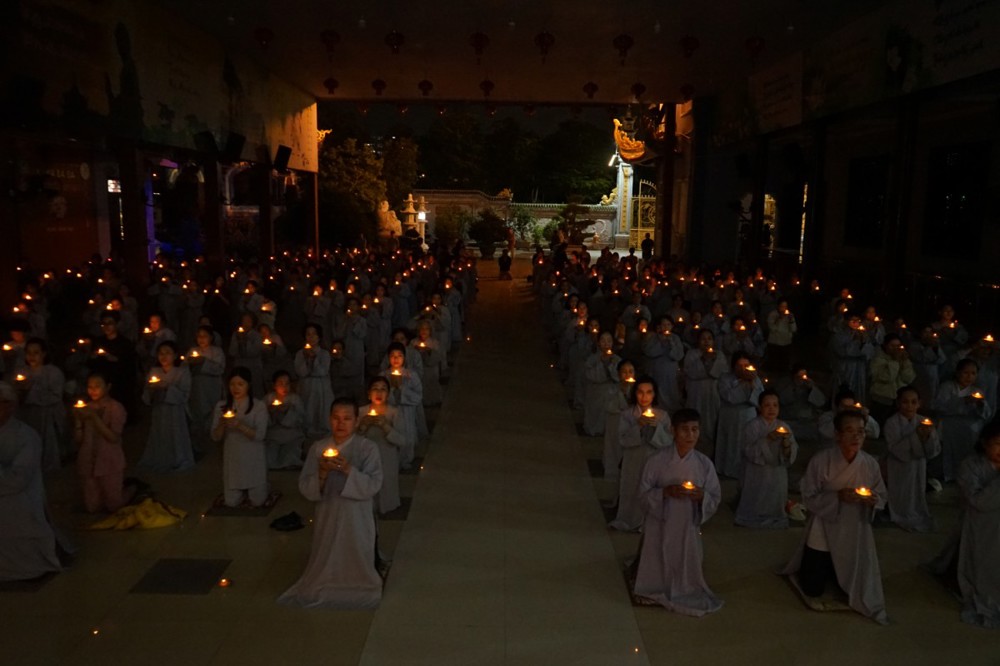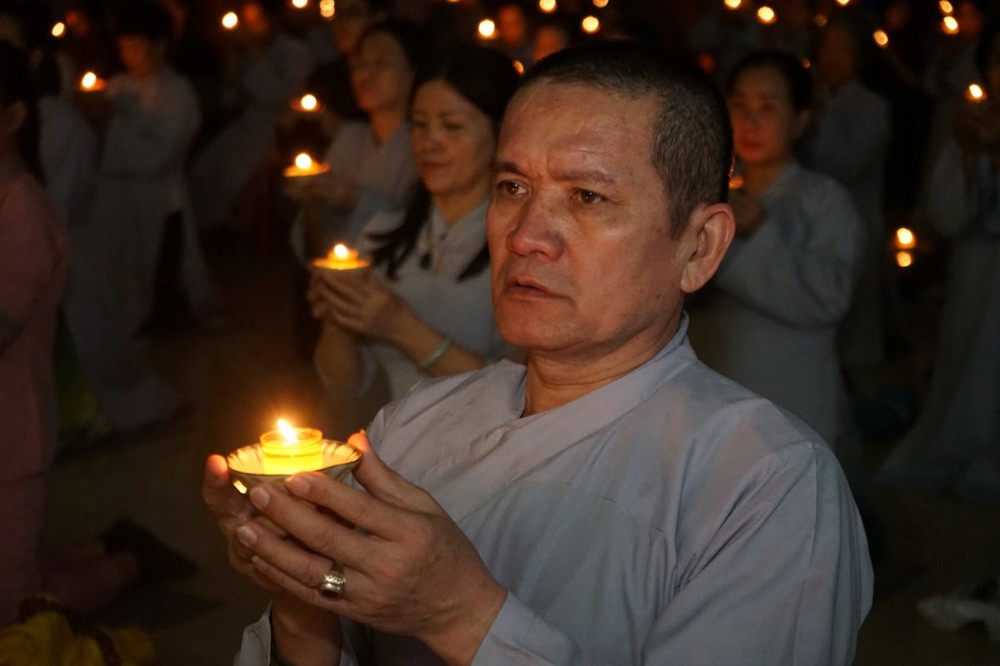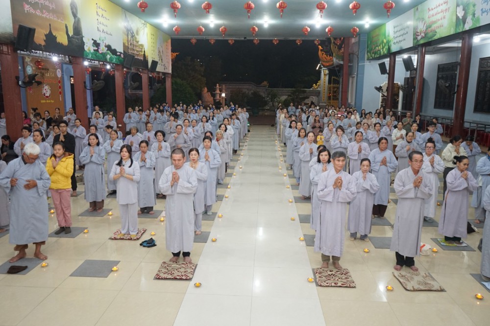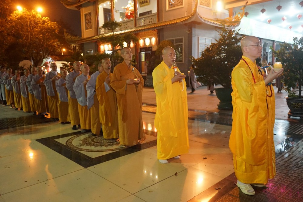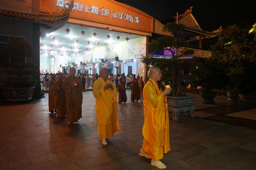 Trong đêm tối, những ngọn nến được dâng lên cúng dường Đức Phật A Di Đà, thắp sáng Diệu Pháp Đường chùa Bà Đa, là tấm lòng của những người con Phật hướng về Đức Từ phụ, nguyện một dạ chí thành hành trì pháp môn Tịnh độ để theo Ngài về cõi an lành.