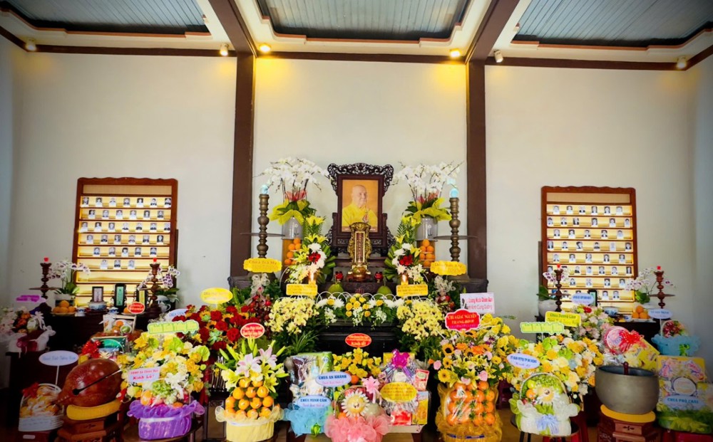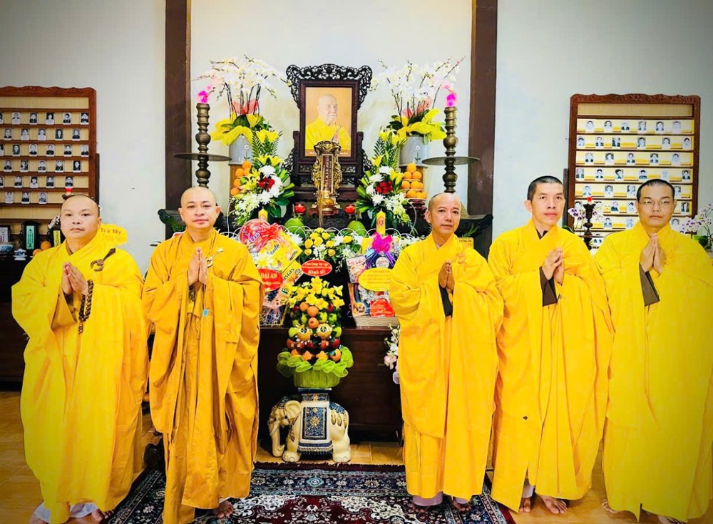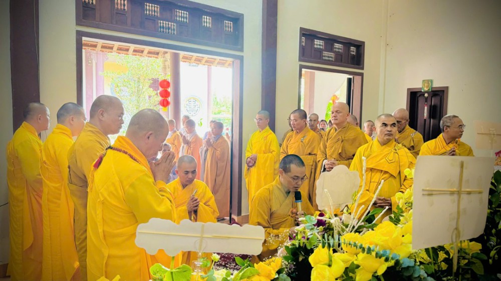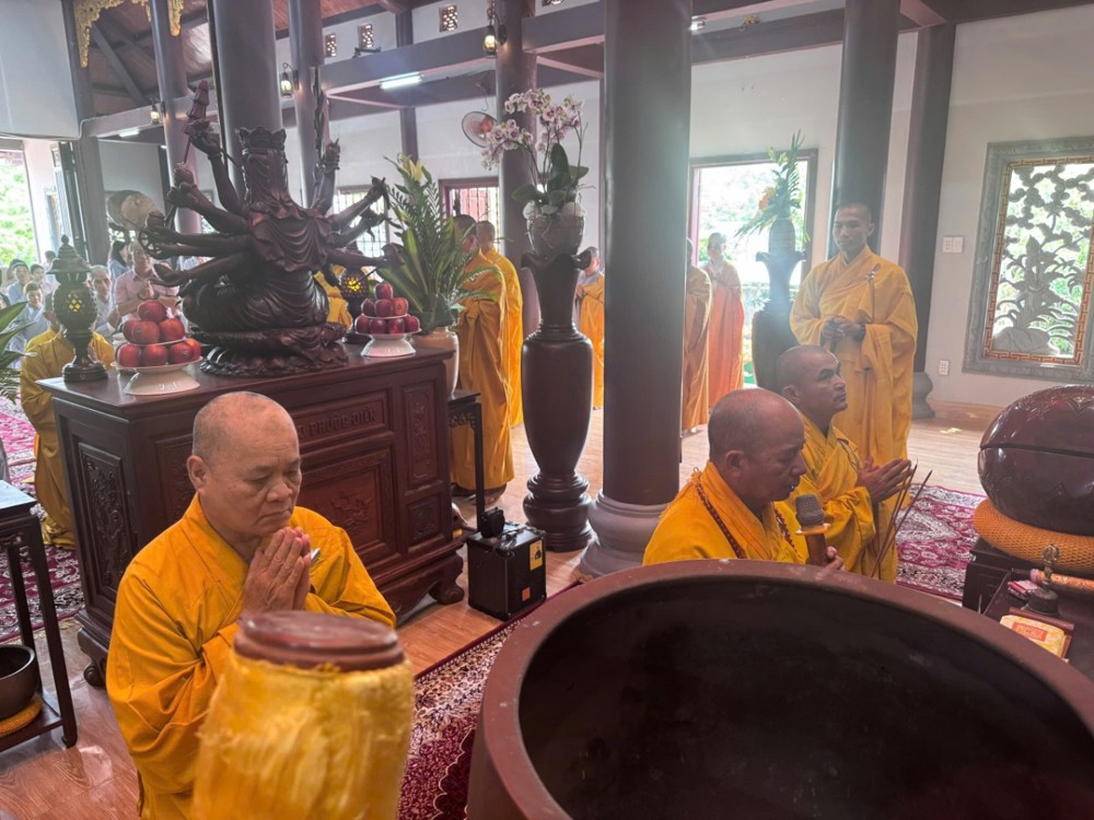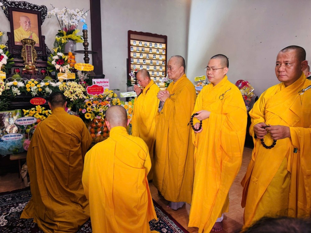 Tiếp đó, trong không khí thanh tịnh và nhất tâm, toàn thể đạo tràng trang nghiêm cử hành nghi thức dâng cúng Tôn sư và tiến cúng chư hương linh. Tiếng kinh Bát-nhã trầm hùng vang vọng, kết tụ tâm thành của đại chúng, nguyện cầu giác linh cố Trưởng lão Hòa thượng cao đăng Phật quốc, chư hương linh tiền bối hữu công đồng siêu sanh tịnh cảnh.