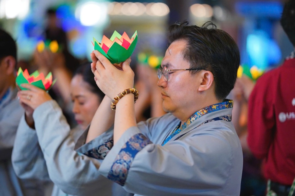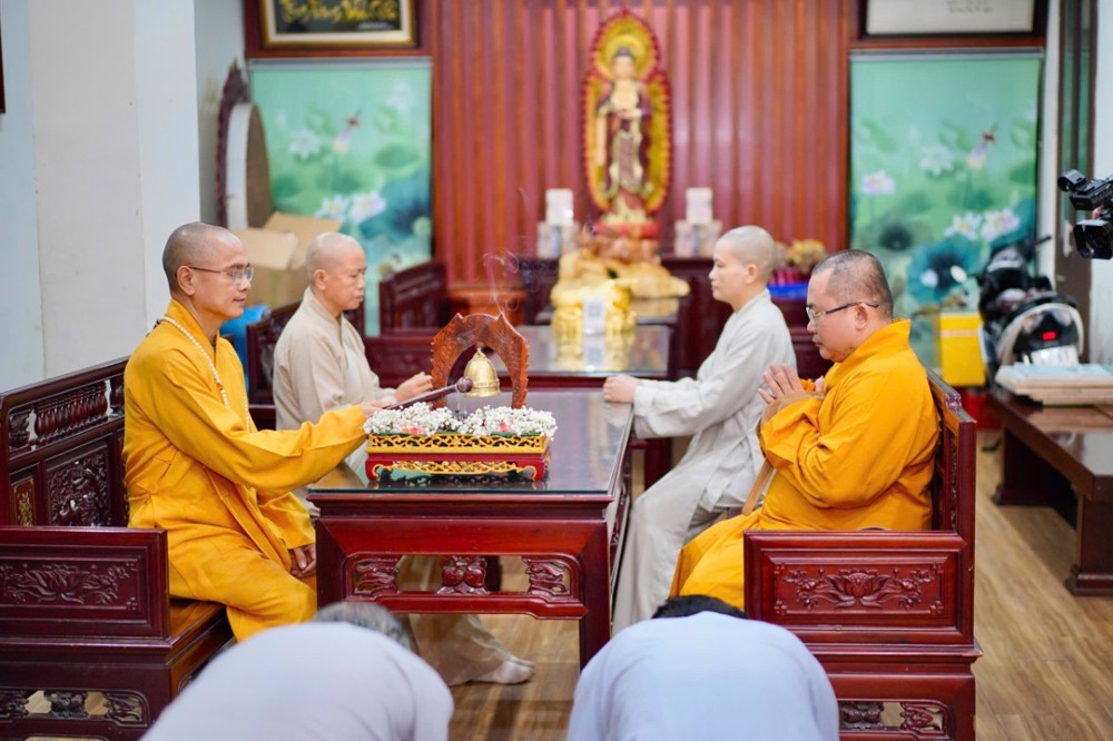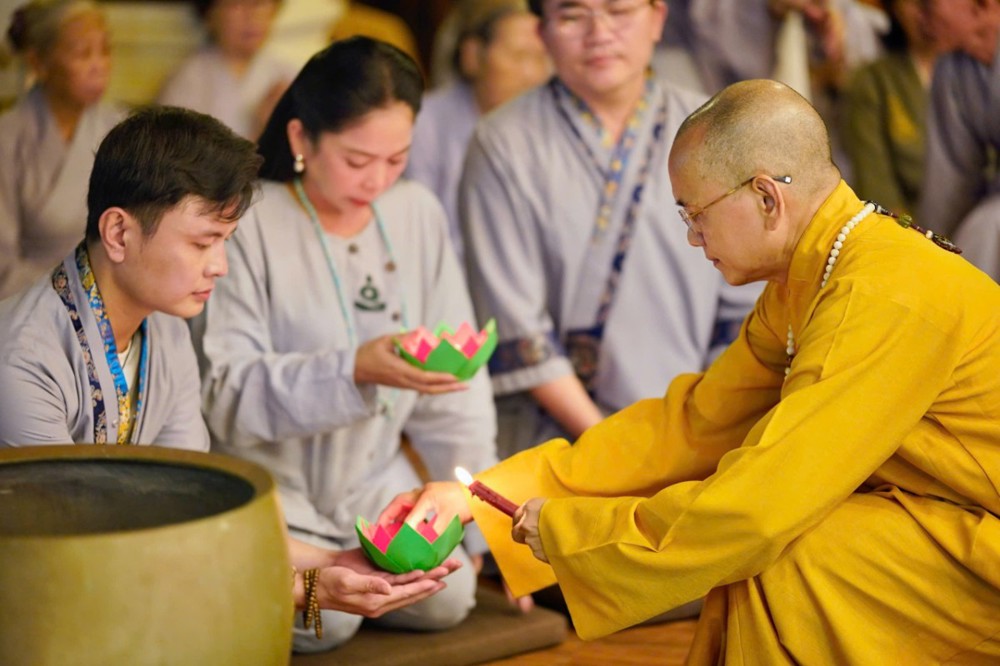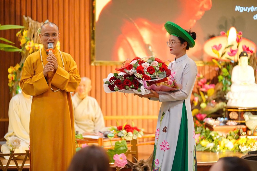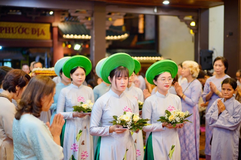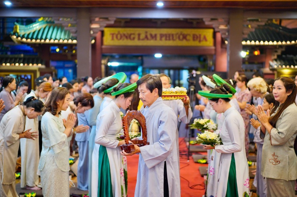 Trước khi buổi lễ chính thức bắt đầu, đại chúng đã trang nghiêm cử hành nghi thức dâng trà cúng Phật – từng chén trà thơm được dâng lên Tam Bảo như lời tri ân, lời nguyện cầu bình an gửi đến quê hương sau những ngày gồng mình trong thiên tai.