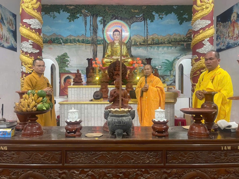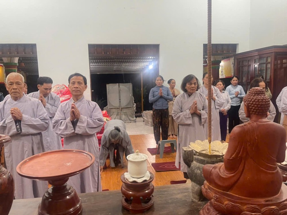 Buổi tối tại đạo tràng, chư Tôn đức cùng Phật tử đã trang nghiêm thiết lập đạo tràng và tụng thời kinh cầu siêu cho chư hương linh thọ nạn trong cơn bão lụt vừa qua. Trong không khí thanh tịnh và trầm lắng của tiếng chuông mõ, đại chúng nhất tâm cầu nguyện cho các hương linh sớm siêu thoát, nương nhờ oai lực Tam Bảo mà được vãng sinh về cảnh giới an lành.