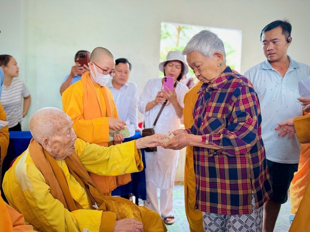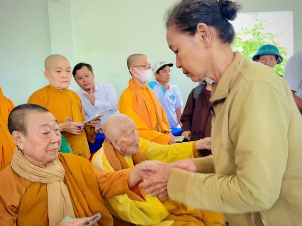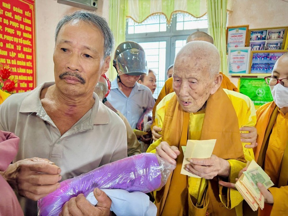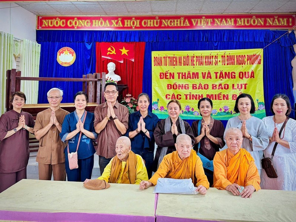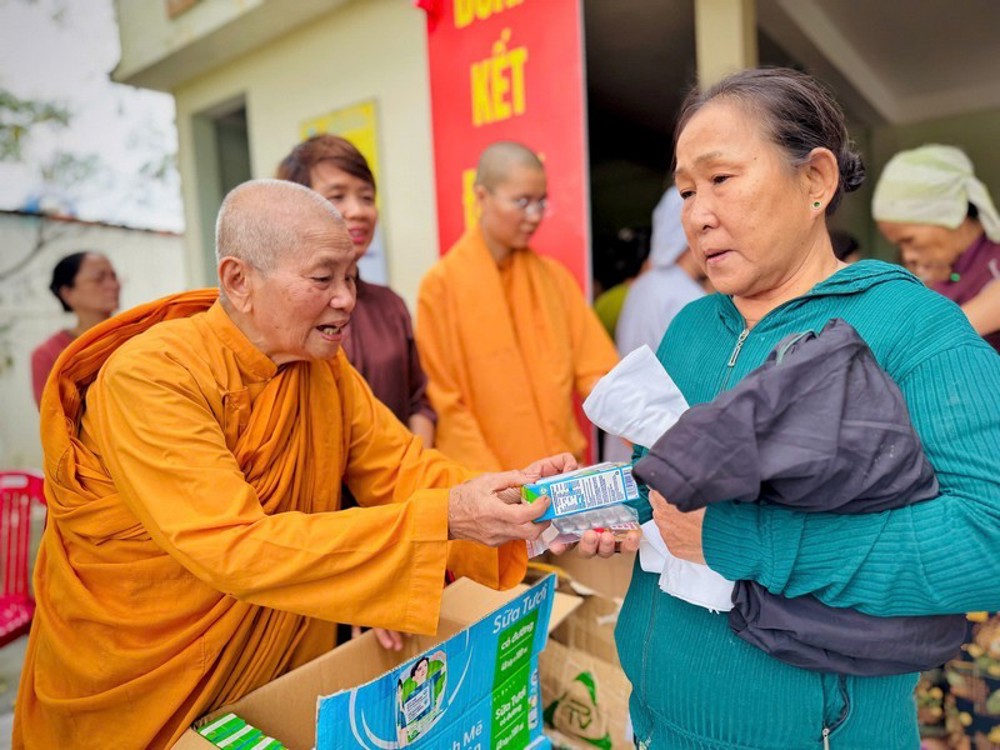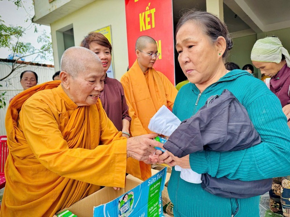 Đặc biệt, hình ảnh Sư bà Chiêu Liên 98 tuổi vẫn kiên trì vượt đường dài, dưới mưa dầm gió lạnh, để cùng đoàn tận tay trao quà đến bà con vùng lũ — hình ảnh khiến ai chứng kiến cũng xúc động, tràn đầy niềm kính quý.