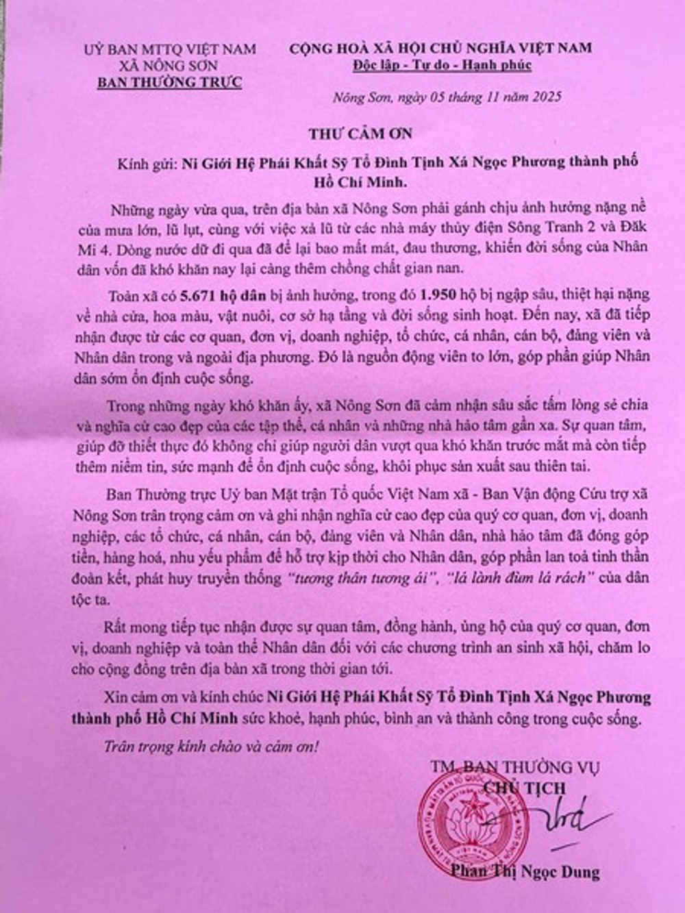 PSO- Ngày 05/11/2025, sau nhiều ngày đi xuyên Việt mang yêu thương đến với đồng bào miền Bắc và miền Trung bị ảnh hưởng bởi mưa lũ, Đoàn Từ thiện Ni giới Hệ phái Khất sĩ - Tổ đình Ngọc Phương (TP.HCM) đã đến xã Điện Bàn Đông và xã Nông Sơn, TP. Đà Nẵng (Quảng Nam cũ) trao 600 phần quà trị giá 710 triệu đồng - đây cũng là điểm dừng cuối cùng của hành trình cứu trợ lần này.