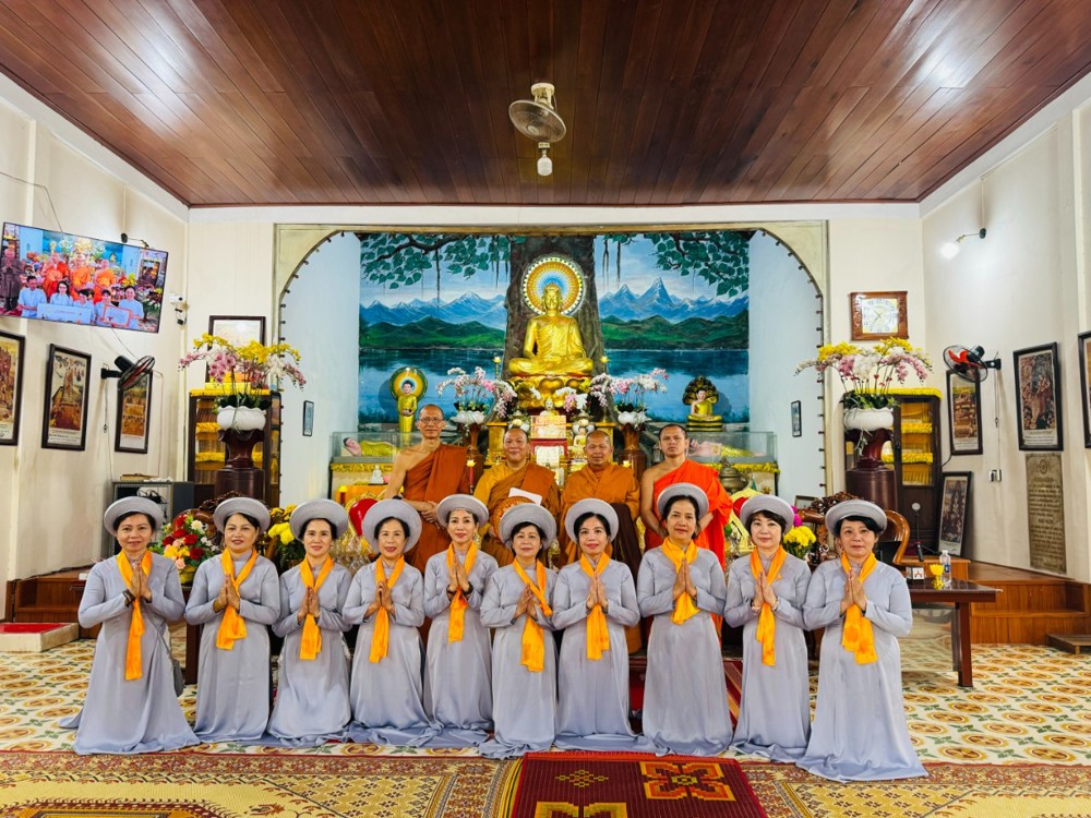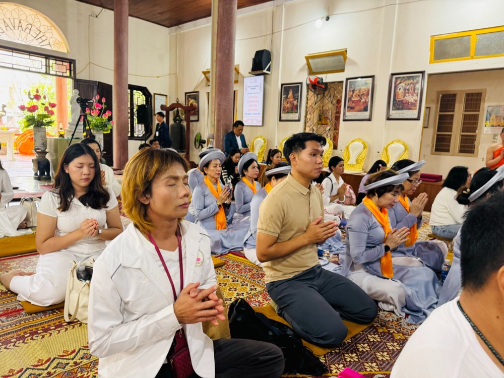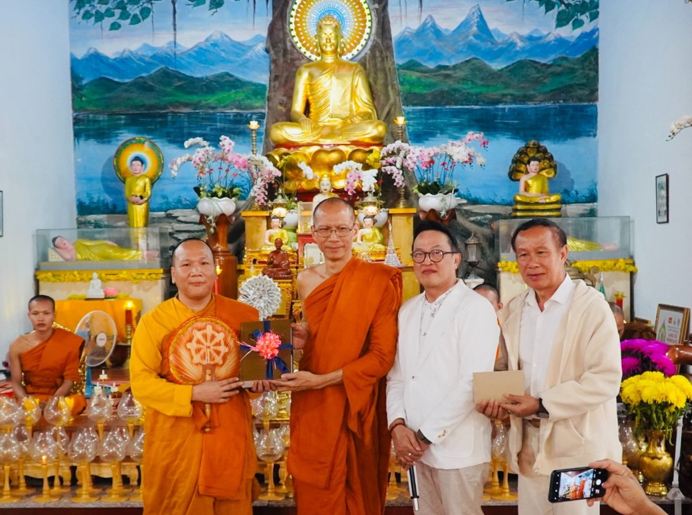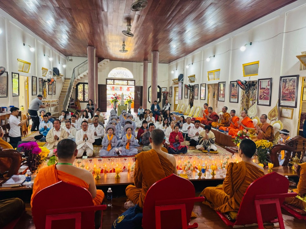 Đón tiếp phái đoàn trong không gian thắm tình đạo vị tại Chánh điện là Đại đức Thích Pháp Hiếu – Phó Chánh Văn phòng Ban Thông tin Truyền thông Trung ương, Ủy viên Ban Phật giáo Quốc tế Trung ương GHPGVN, Ủy viên Hội Hữu nghị Việt Nam – Thái Lan, Trụ trì Chùa Tam Bảo, cùng chư Tăng Phật Tử Việt – Lào – Thái Lan.