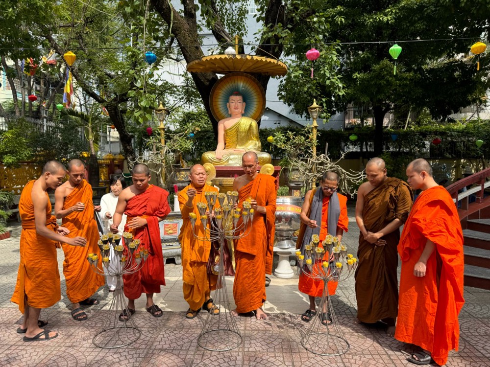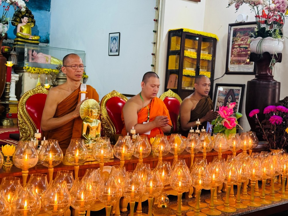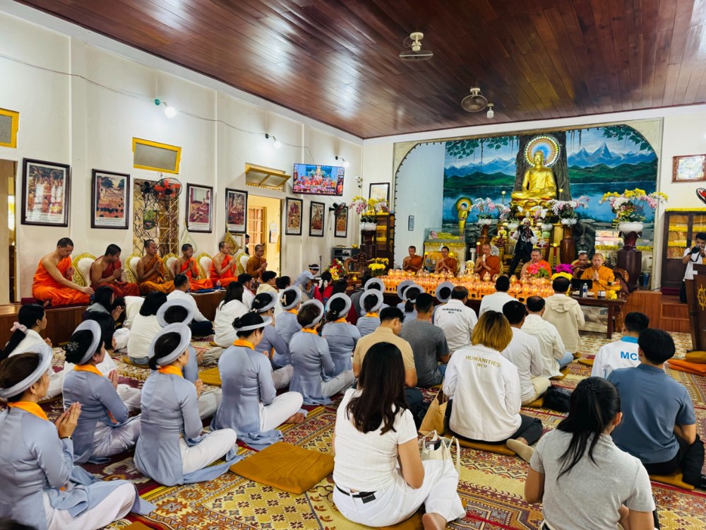 Nối tiếp dòng cảm xúc linh thiêng, Tăng đoàn và sinh viên Đại học MCU đã thực hiện các nghi thức tâm linh truyền thống: dâng hương cúng dường Tam Bảo và thiền hành niệm Phật. Những bước chân chánh niệm cùng ánh đèn hoa đăng lung linh nhiễu ba vòng quanh Đại Tháp Xá Lợi, Đại Thọ Bồ Đề và Kim Thân Phật đã kết tinh thành năng lượng bình an, cầu nguyện cho quốc thái dân an, thế giới hòa bình và chúng sanh an lạc. Cũng trong dịp này, các bạn sinh viên Thái Lan đã có những giây phút giao lưu nồng ấm với Phật tử Việt Nam, cùng nhau tìm hiểu những nét đẹp văn hoá Phật giáo truyền thống, sự gắn kết lâu đời qua các dòng phái, nghi lễ và kiến trúc di sản Thái Lan đang được gìn giữ trân trọng ngay tại mái chùa Việt.