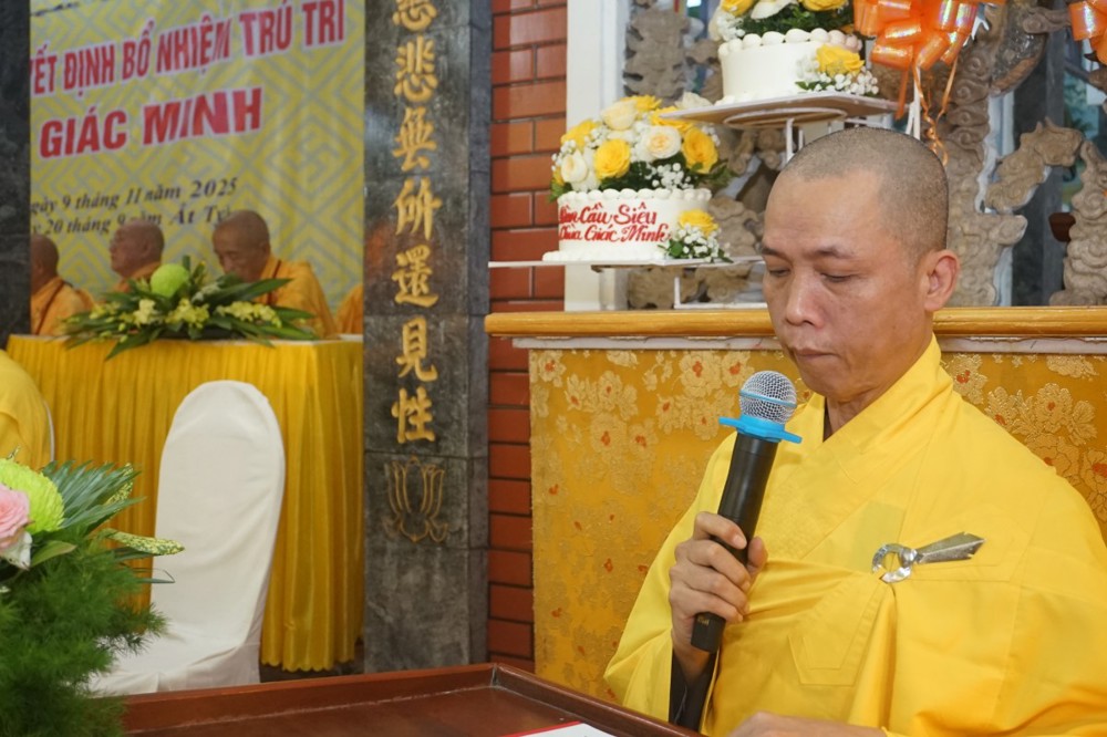 Hòa thượng Thích Từ Nghiêm thay mặt Chư Tôn đức chứng minh ban đạo từ sách tấn Đại đức Tân Trú trì, mong rằng Đại đức sẽ không phụ lòng tin tưởng của Giáo hội đã giao phó nhiệm vụ Trú trì chùa Giác Minh, hoằng dương Phật pháp, hướng dẫn đồng bào Phật tử tu học.