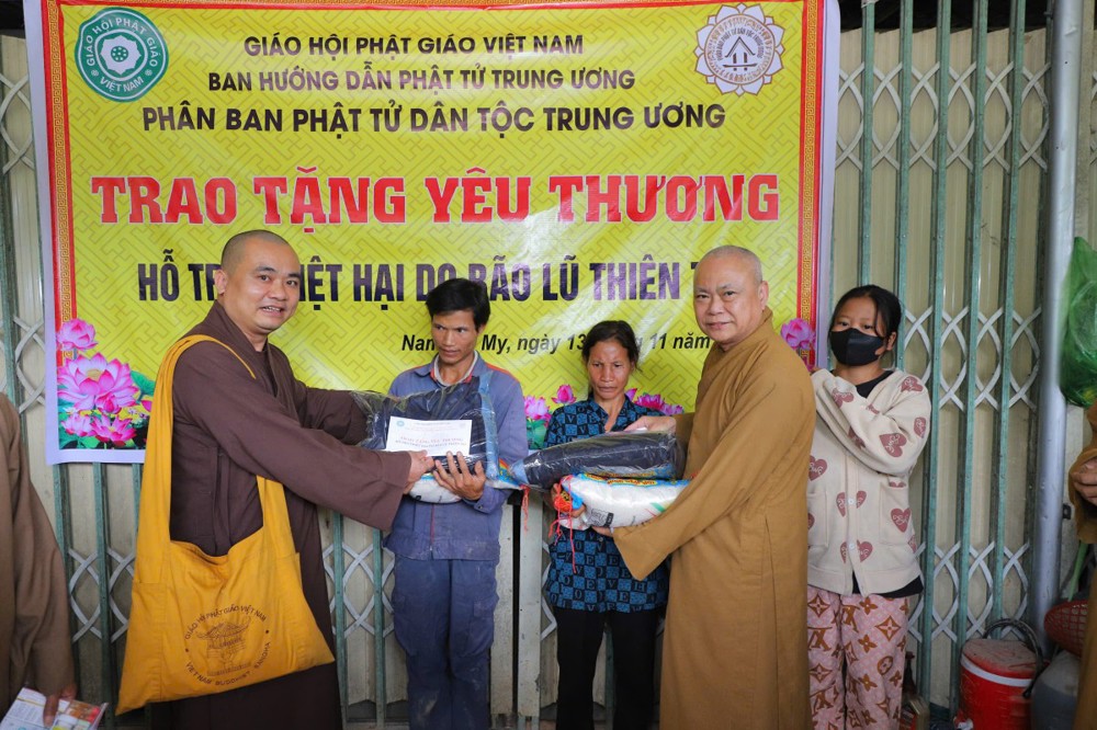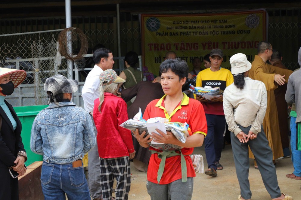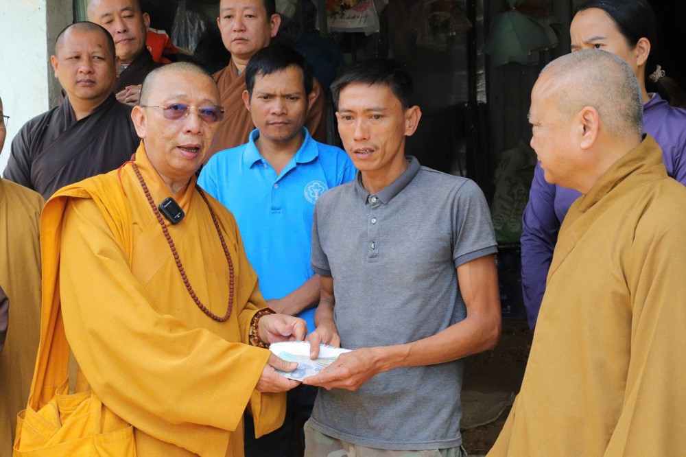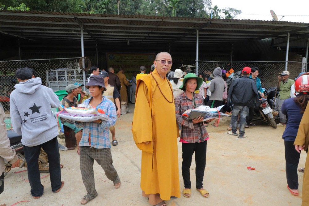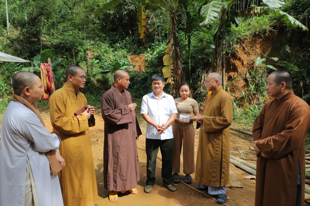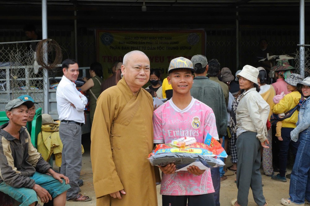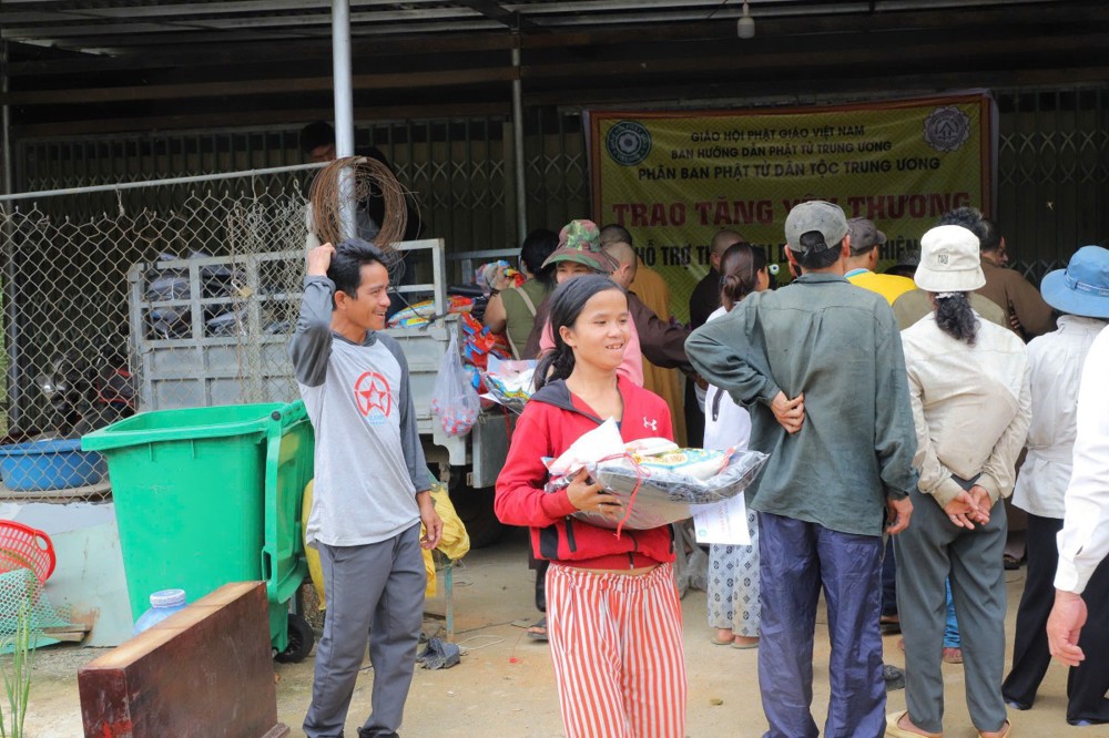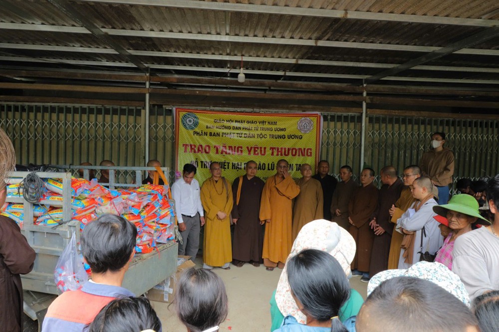 Phát biểu tại buổi trao tặng, Thượng tọa Thích Quảng Tuấn chia sẻ, những ngày qua, chúng tôi biết tin đồng bào nơi đây chịu nhiều thiệt hại do sạt lở đất, cuộc sống còn nhiều khó khăn. Mỗi phần quà hôm nay là tấm lòng của chư Tăng Ni, Phật tử khắp nơi gửi gắm, mong được sẻ chia phần nào mất mát với bà con. Tinh thần từ bi của đạo Phật không chỉ nằm trong lời kinh, mà còn thể hiện qua hành động giúp người, cứu khổ. Hy vọng bà con giữ vững niềm tin, cùng nhau vượt qua khó khăn để sớm ổn định cuộc sống.