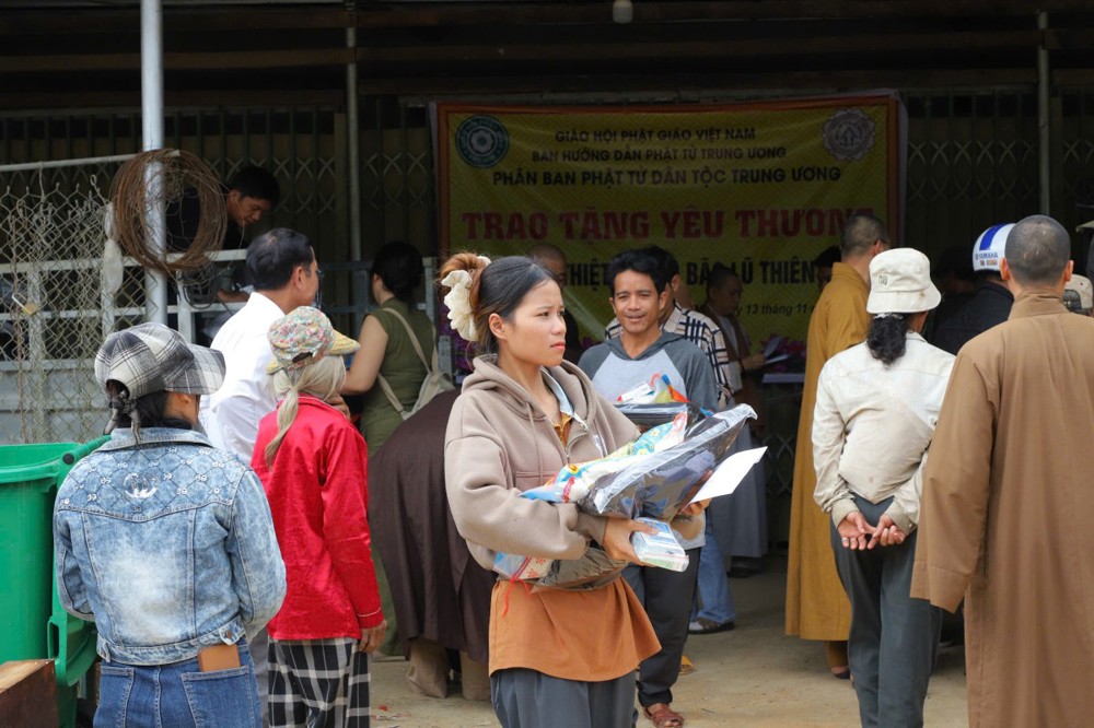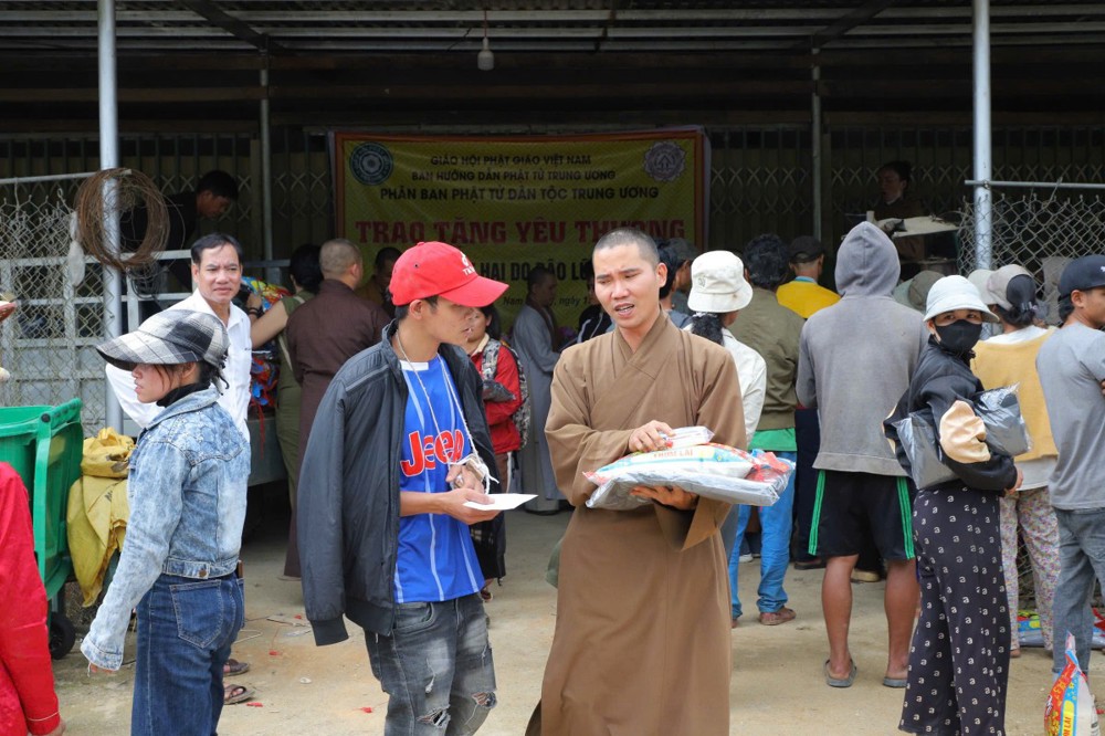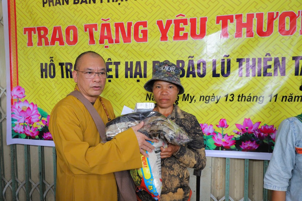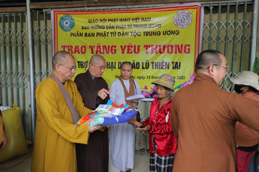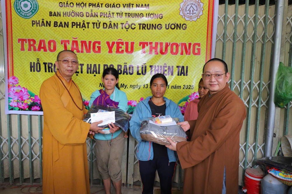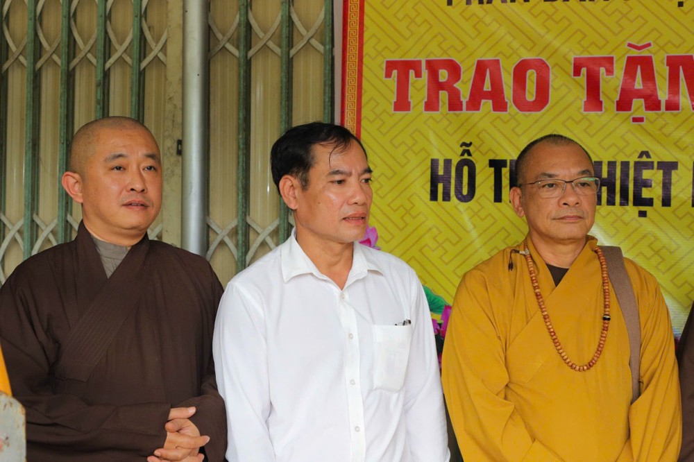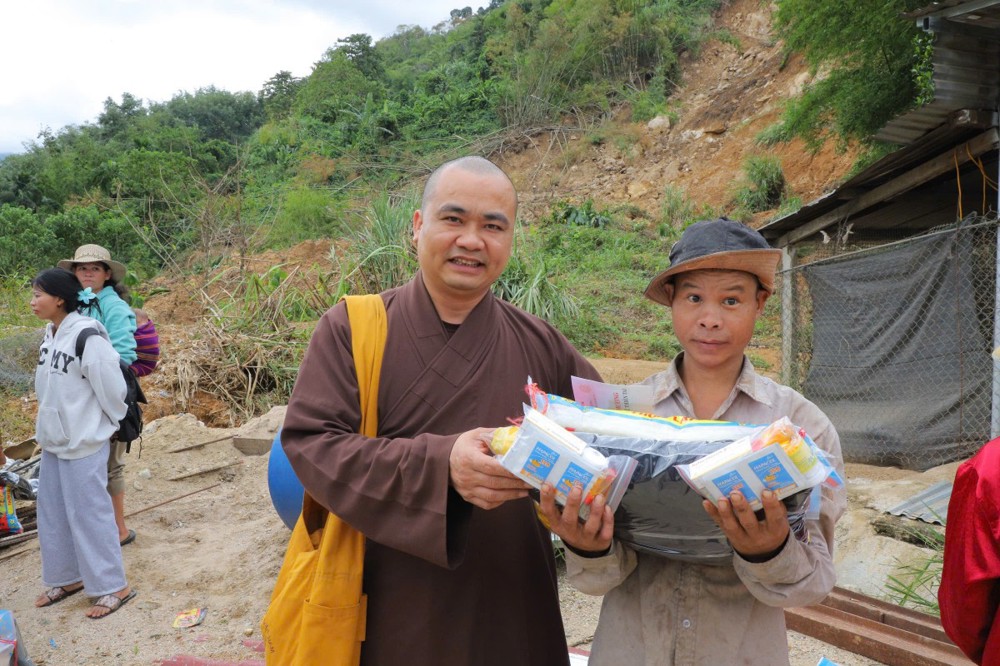 Phát biểu tại buổi trao tặng, Thượng tọa Thích Quảng Tuấn chia sẻ, những ngày qua, chúng tôi biết tin đồng bào nơi đây chịu nhiều thiệt hại do sạt lở đất, cuộc sống còn nhiều khó khăn. Mỗi phần quà hôm nay là tấm lòng của chư Tăng Ni, Phật tử khắp nơi gửi gắm, mong được sẻ chia phần nào mất mát với bà con. Tinh thần từ bi của đạo Phật không chỉ nằm trong lời kinh, mà còn thể hiện qua hành động giúp người, cứu khổ. Hy vọng bà con giữ vững niềm tin, cùng nhau vượt qua khó khăn để sớm ổn định cuộc sống.