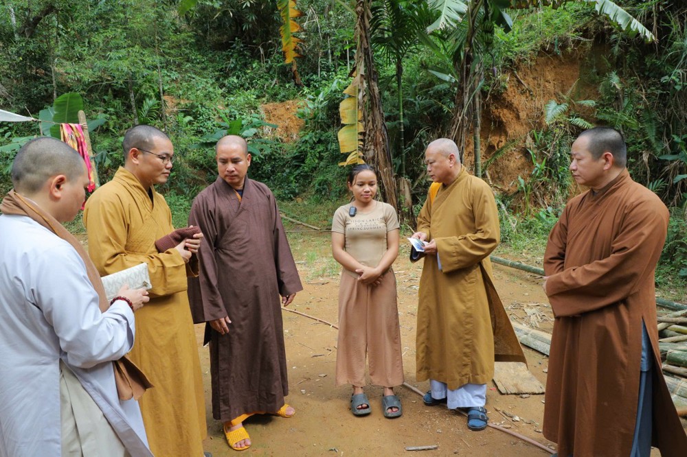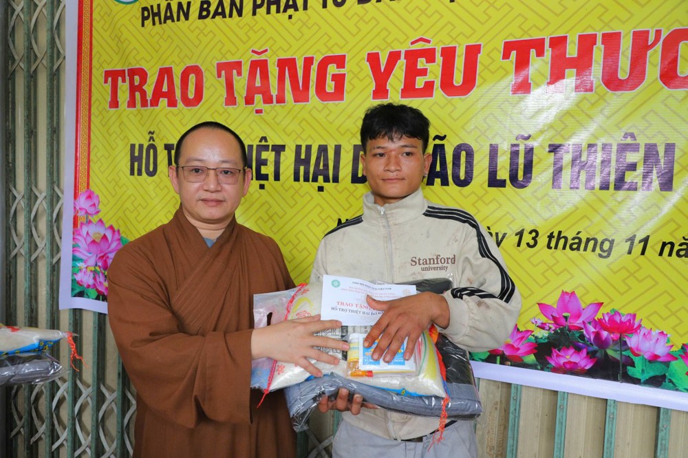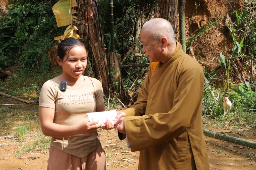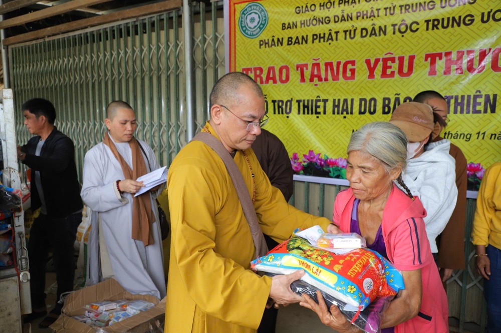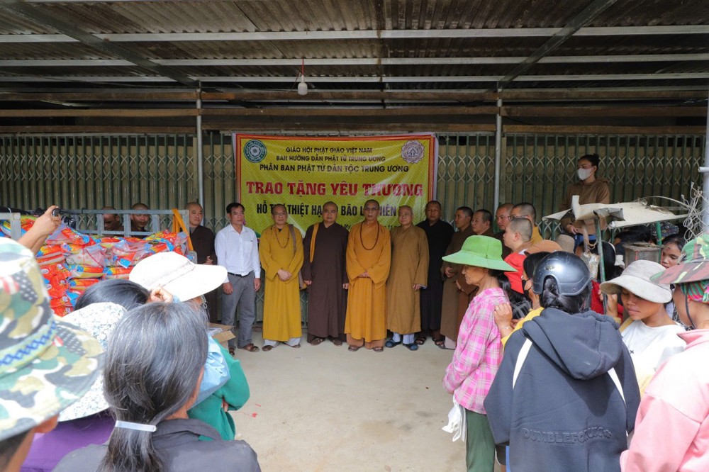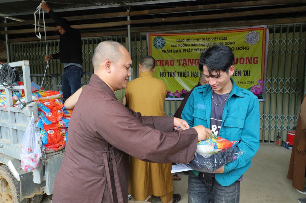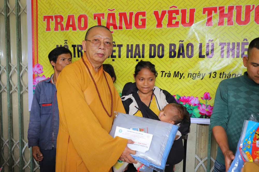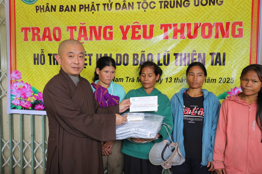 Phát biểu tại buổi trao tặng, Thượng tọa Thích Quảng Tuấn chia sẻ, những ngày qua, chúng tôi biết tin đồng bào nơi đây chịu nhiều thiệt hại do sạt lở đất, cuộc sống còn nhiều khó khăn. Mỗi phần quà hôm nay là tấm lòng của chư Tăng Ni, Phật tử khắp nơi gửi gắm, mong được sẻ chia phần nào mất mát với bà con. Tinh thần từ bi của đạo Phật không chỉ nằm trong lời kinh, mà còn thể hiện qua hành động giúp người, cứu khổ. Hy vọng bà con giữ vững niềm tin, cùng nhau vượt qua khó khăn để sớm ổn định cuộc sống.