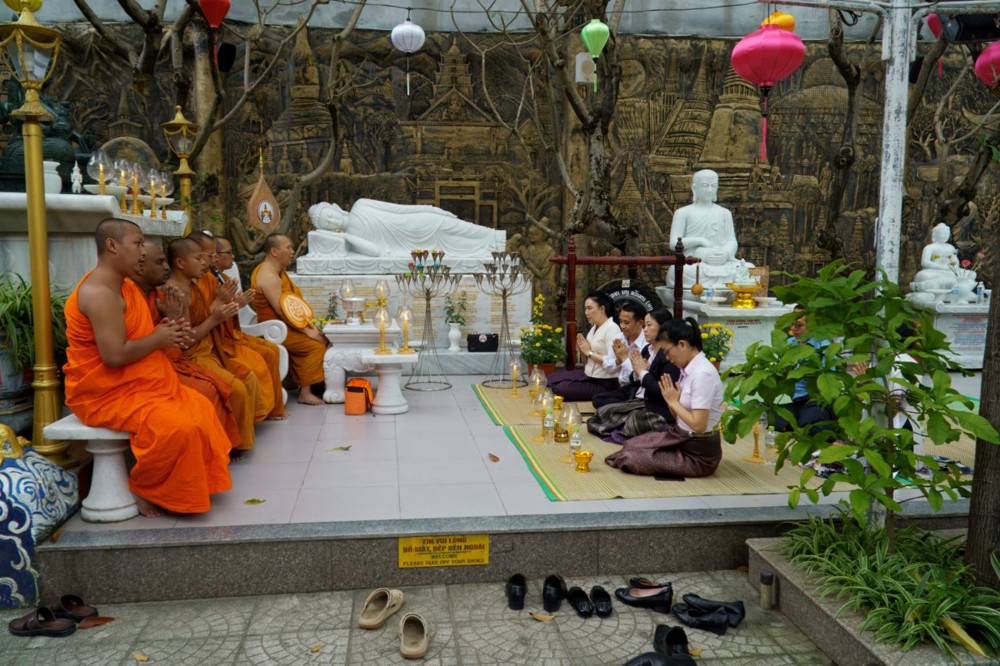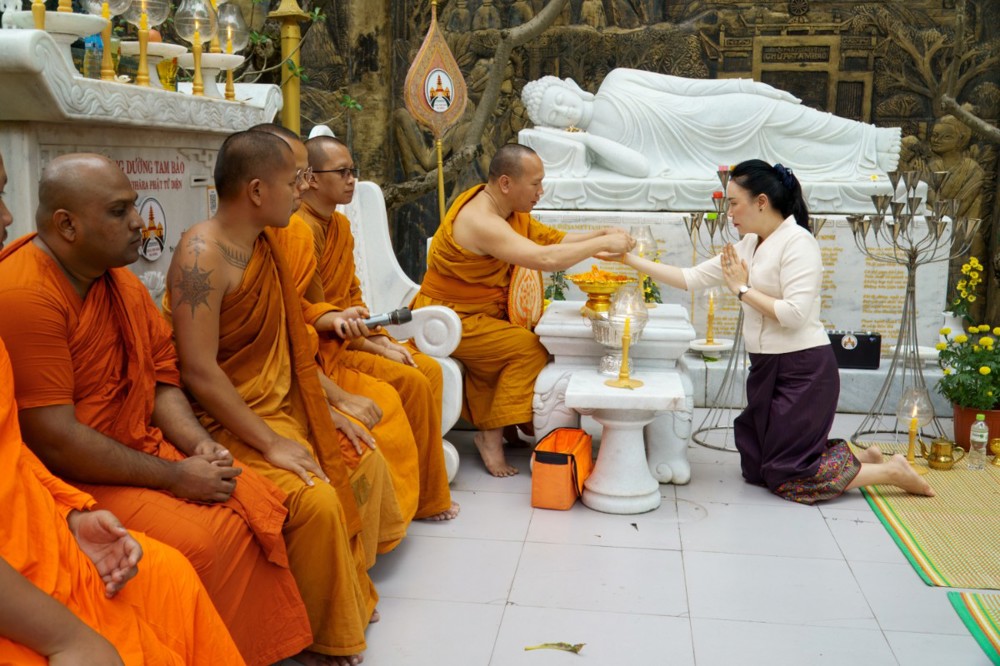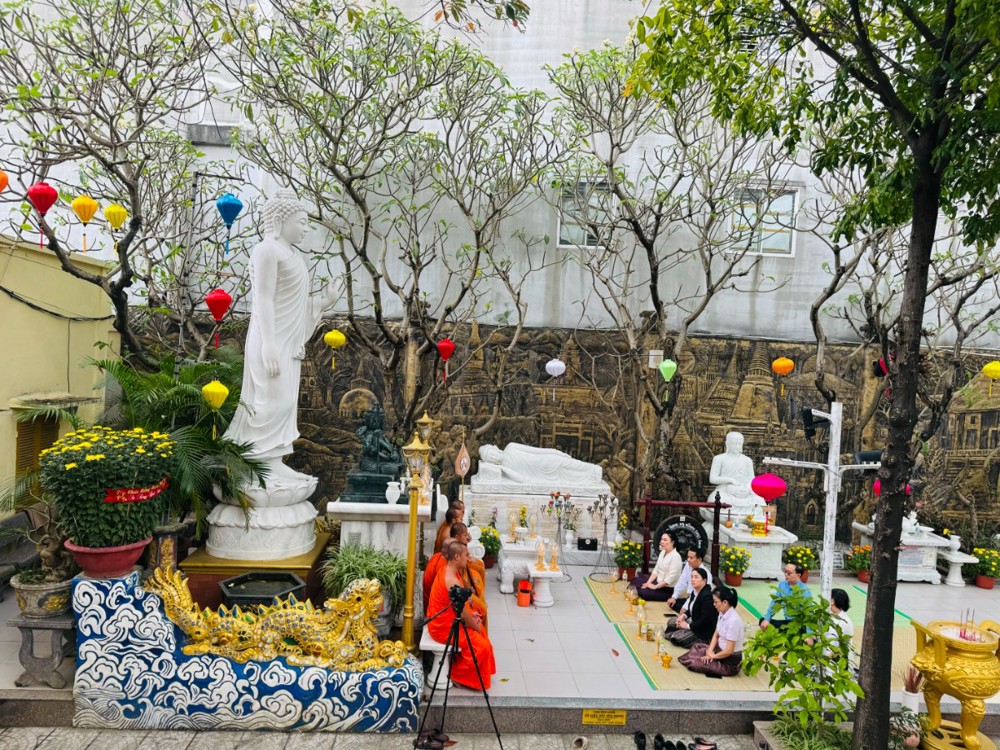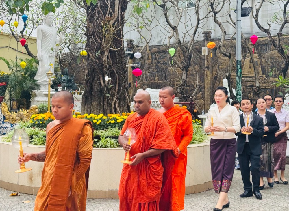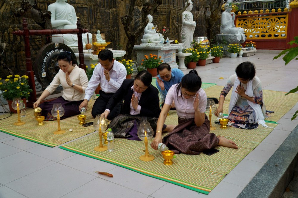 Giữa không gian thanh tịnh của vườn thiền hoa Chăm Pa ngát hương gợi nhớ về xứ sở Triệu Voi, đoàn Tổng Lãnh sự đã thực hiện các nghi thức tâm linh truyền thống. Trong sự hướng dẫn của chư Tăng, phái đoàn đã thành kính dâng hoa, thắp nến thiền đăng và đi thiền hành nhiễu quanh Đại Hùng Bửu Điện, Đại Thọ Bồ Đề và Kim Thân Phật tổ.