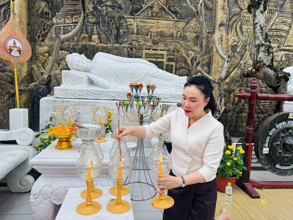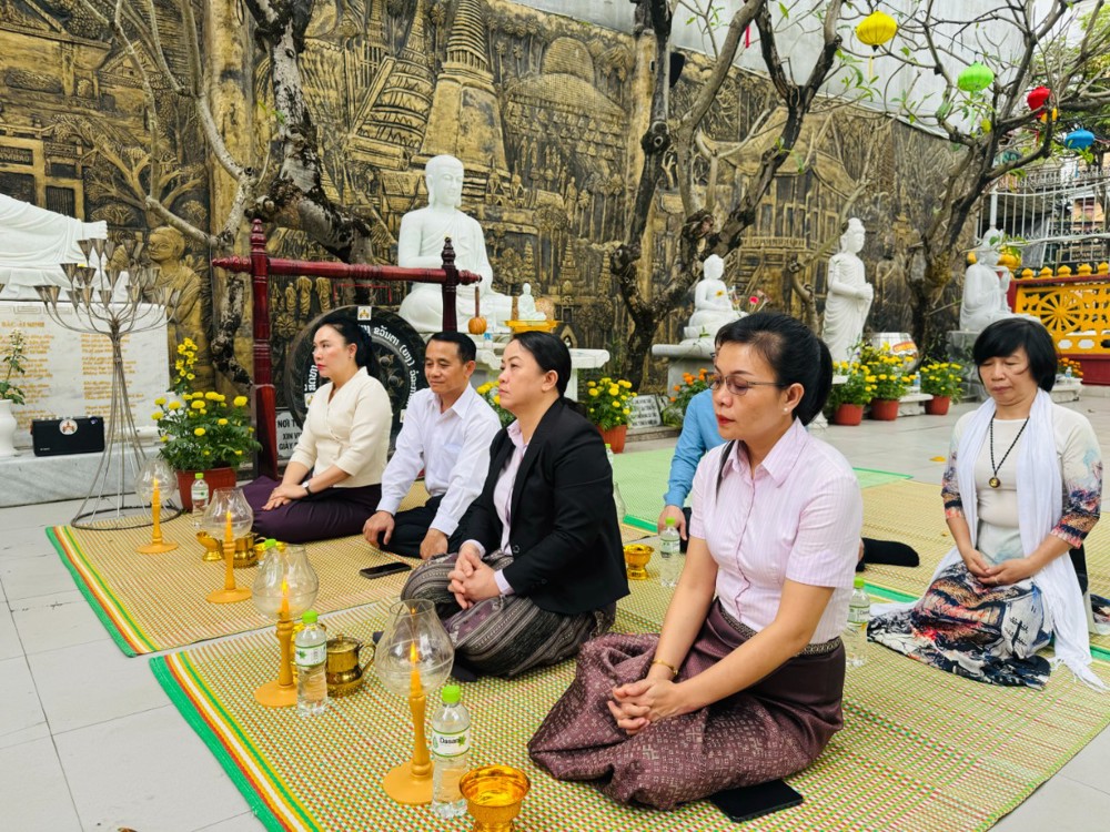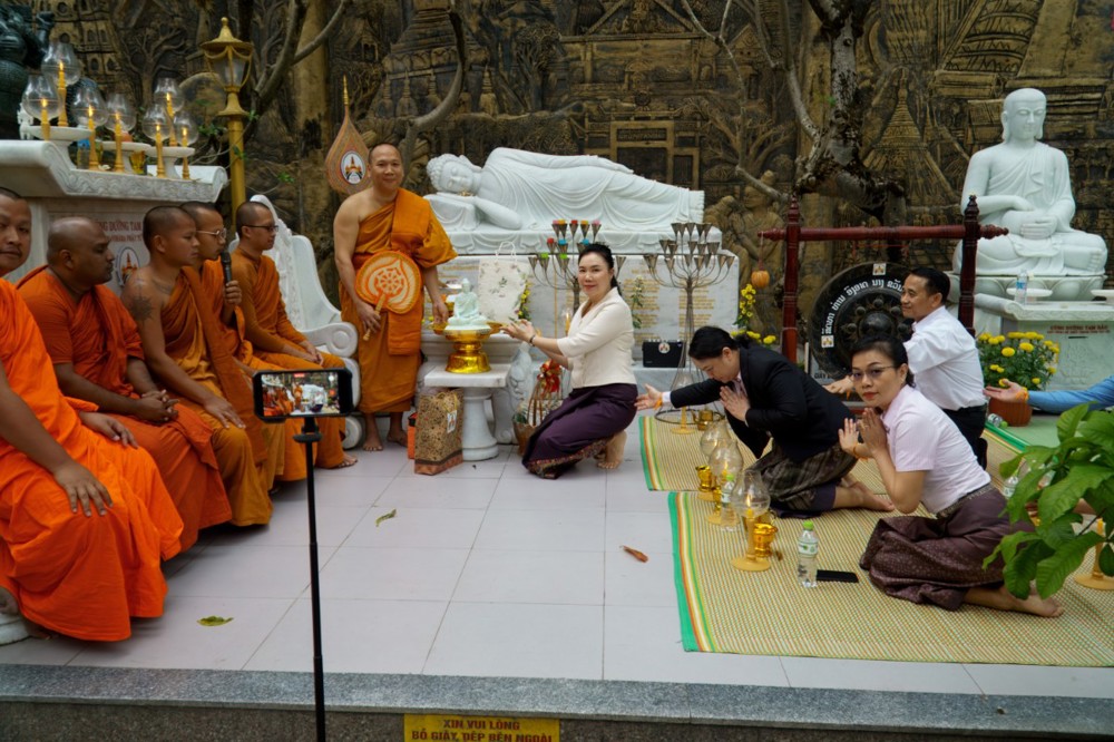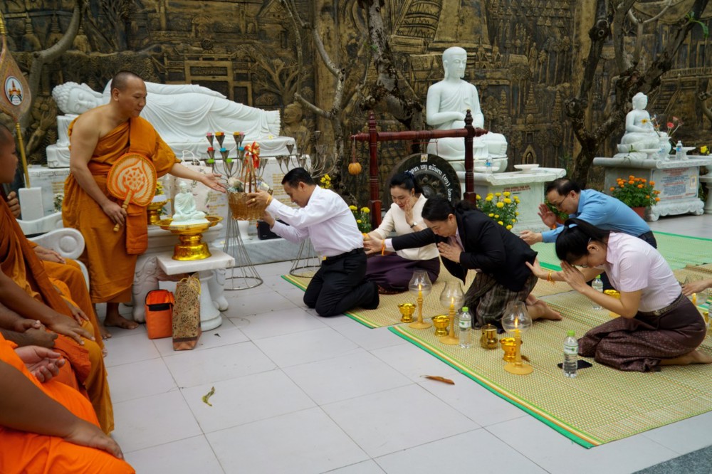 Tại buổi tiếp đón, bà Tân Tổng Lãnh sự cùng các thành viên trong đoàn đã thành kính cúng dường các vật dụng sinh hoạt đến chư Tăng. Đáp lại tấm chân tình đó, chư Tăng đã thực hiện nghi thức tụng kinh Pali chúc phúc, thuyết giảng ngắn về ý nghĩa ngày Tết cổ truyền và đặc biệt là nghi thức buộc chỉ cổ tay – một nét văn hóa tâm linh cầu may mắn, bình an đặc trưng của người dân Lào.