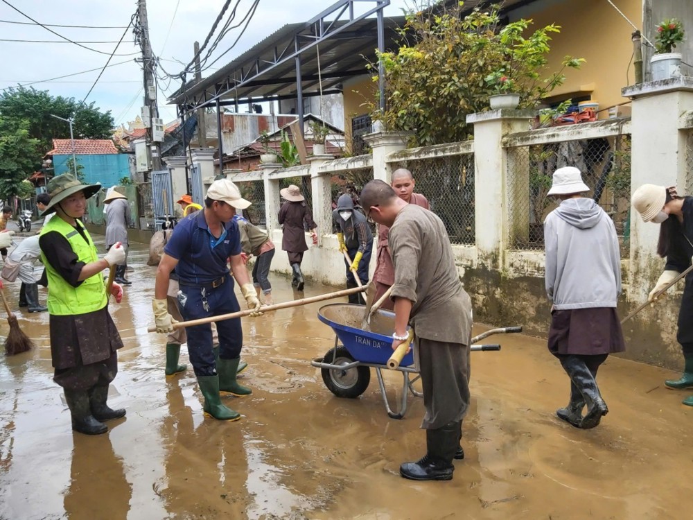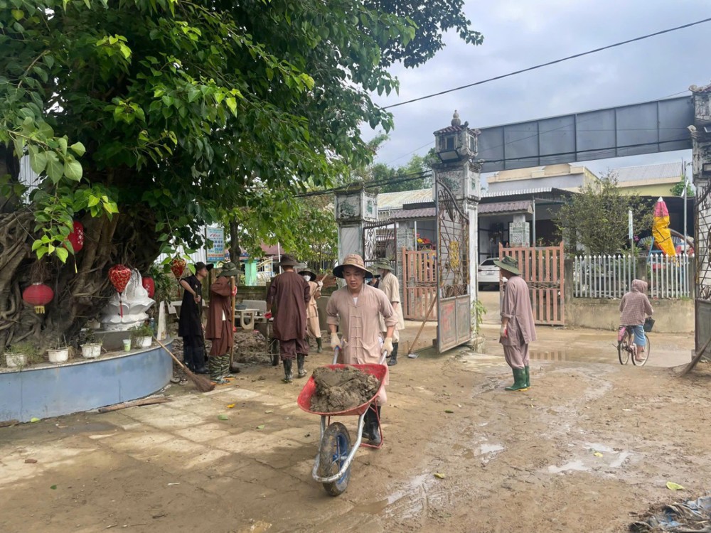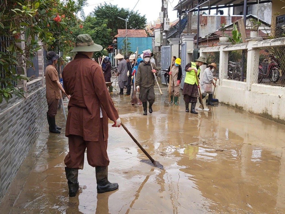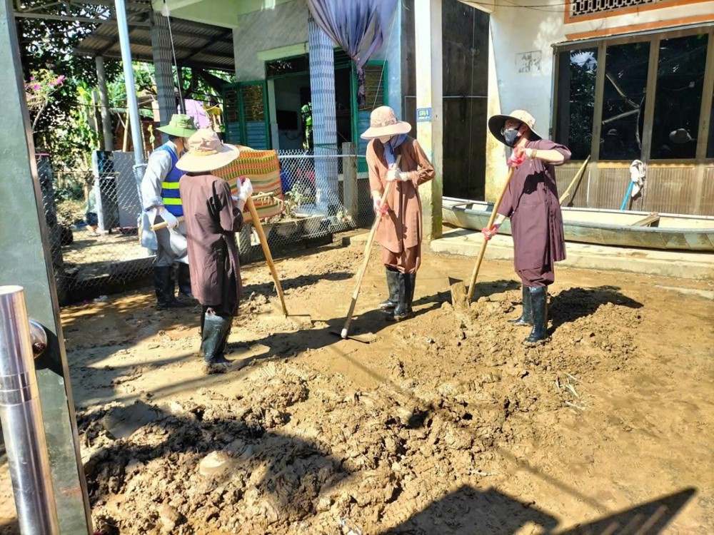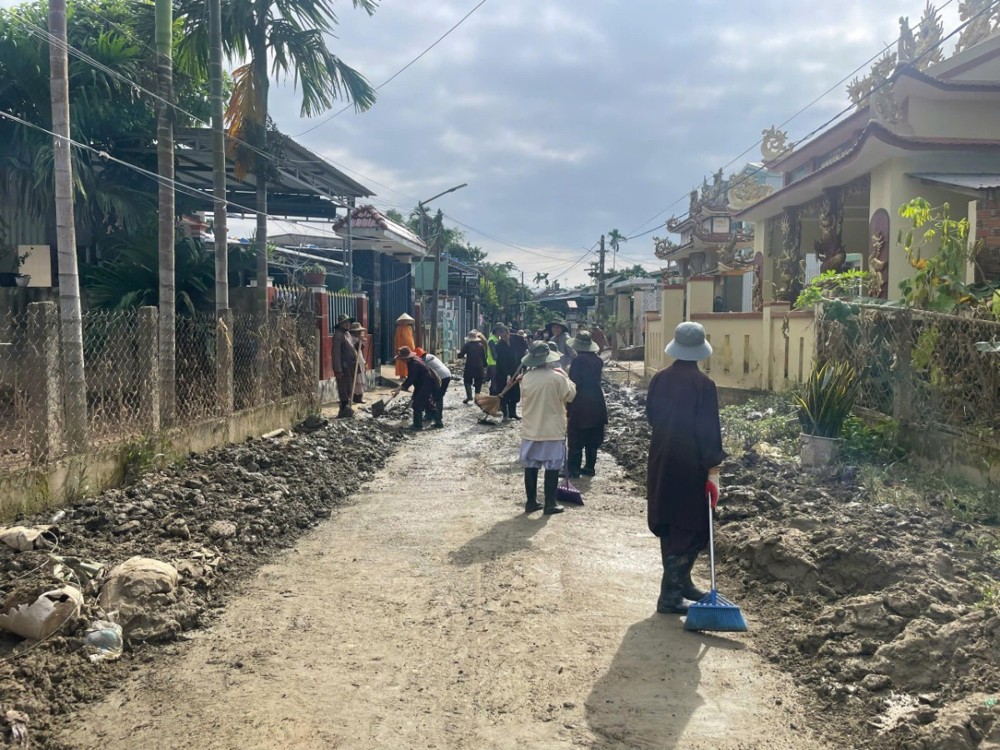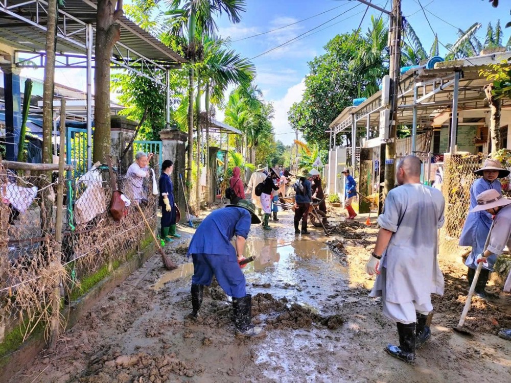 Không dừng lại ở việc trao tặng những phần quà vật chất, đoàn còn trực tiếp xắn tay dọn dẹp bùn lầy, khai thông đường sá, thu gom rác thải và vệ sinh các khu vực bị ngập sâu do mưa lũ. Mỗi bước chân lấm bùn là một lời cầu nguyện thầm lặng, mỗi bàn tay góp sức là một bông hoa của lòng từ bi được nở giữa hoạn nạn.