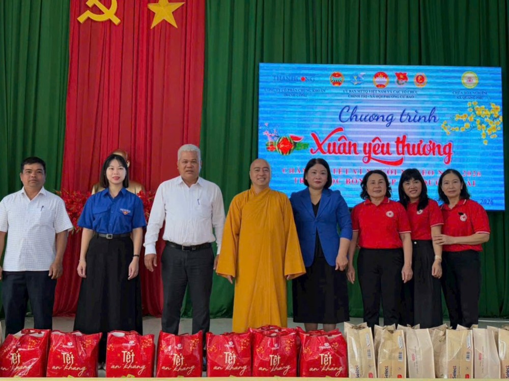 PSO - Chiều 05/2, chùa Hoa Nghiêm phối hợp cùng Đảng ủy – HĐND – UBND – Ủy ban MTTQ Việt Nam phường Cư Bao tổ chức chương trình “Tết vì người nghèo” và trao học bổng “Tiếp bước em đến trường” Xuân Bính Ngọ 2026, nhằm chăm lo, hỗ trợ người nghèo trên địa bàn phường có thêm điều kiện đón Tết cổ truyền vui tươi, đầm ấm.
