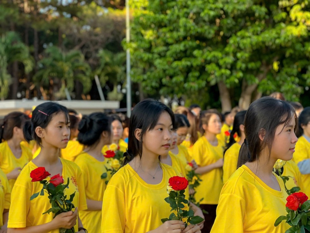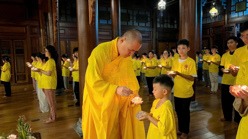 Trong đêm lễ hoa đăng mừng Phật đản, các khóa sinh dâng lên đóa liên đăng cúng dường Tam Bảo, cầu nguyện cho đất nước hòa bình, gia đình an ổn.