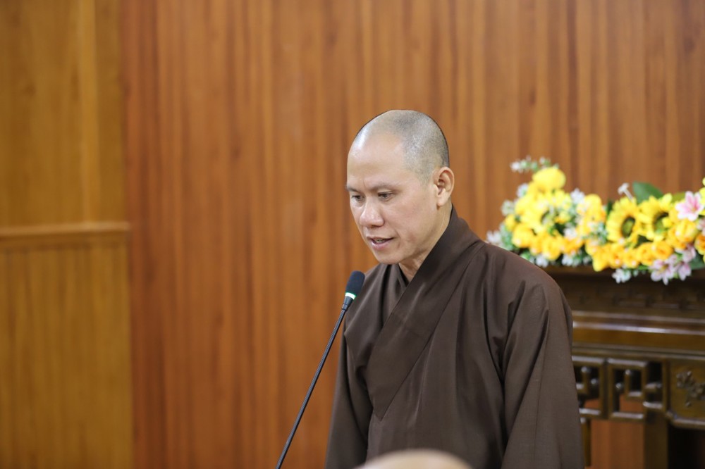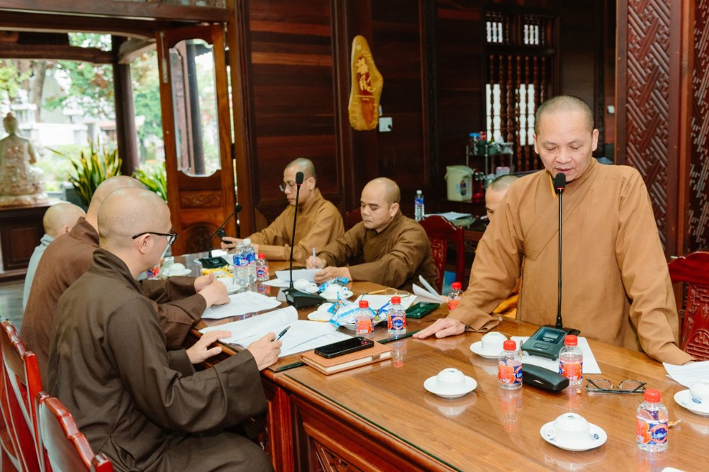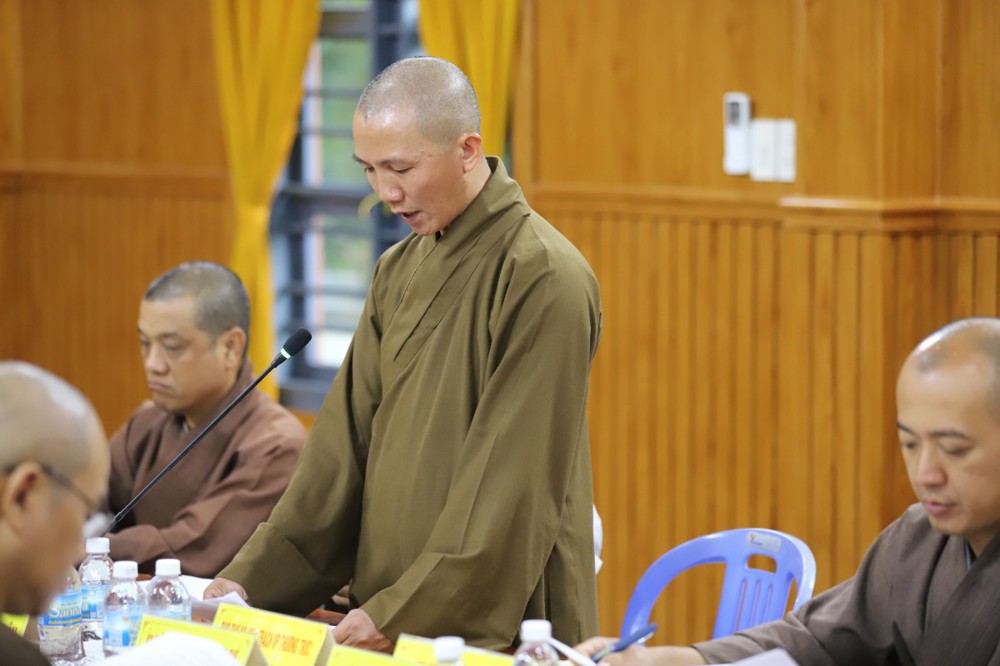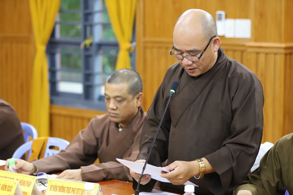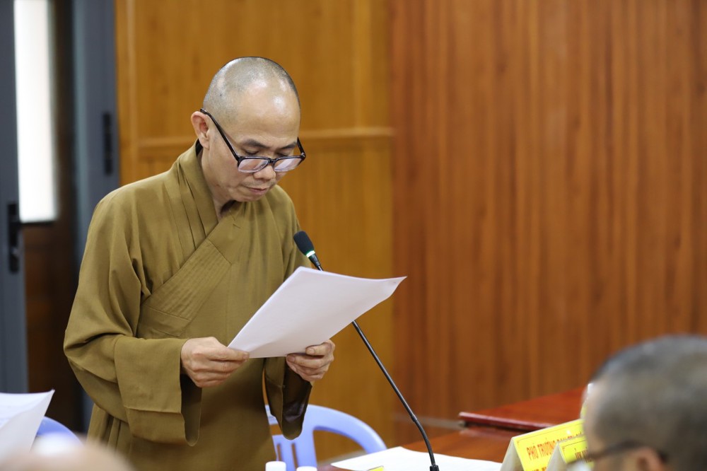 Đại đức Thích Minh Phương, Phó Thư ký - Chánh Văn phòng trình bày dự thảo hội nghị tổng kết công tác Phật sự năm 2025. Dự kiến thời gian tổ chức ngày 14/1/2026 (nhằm 26/11 Ất Tỵ), địa điểm chùa Sắc tứ Khải Đoan.